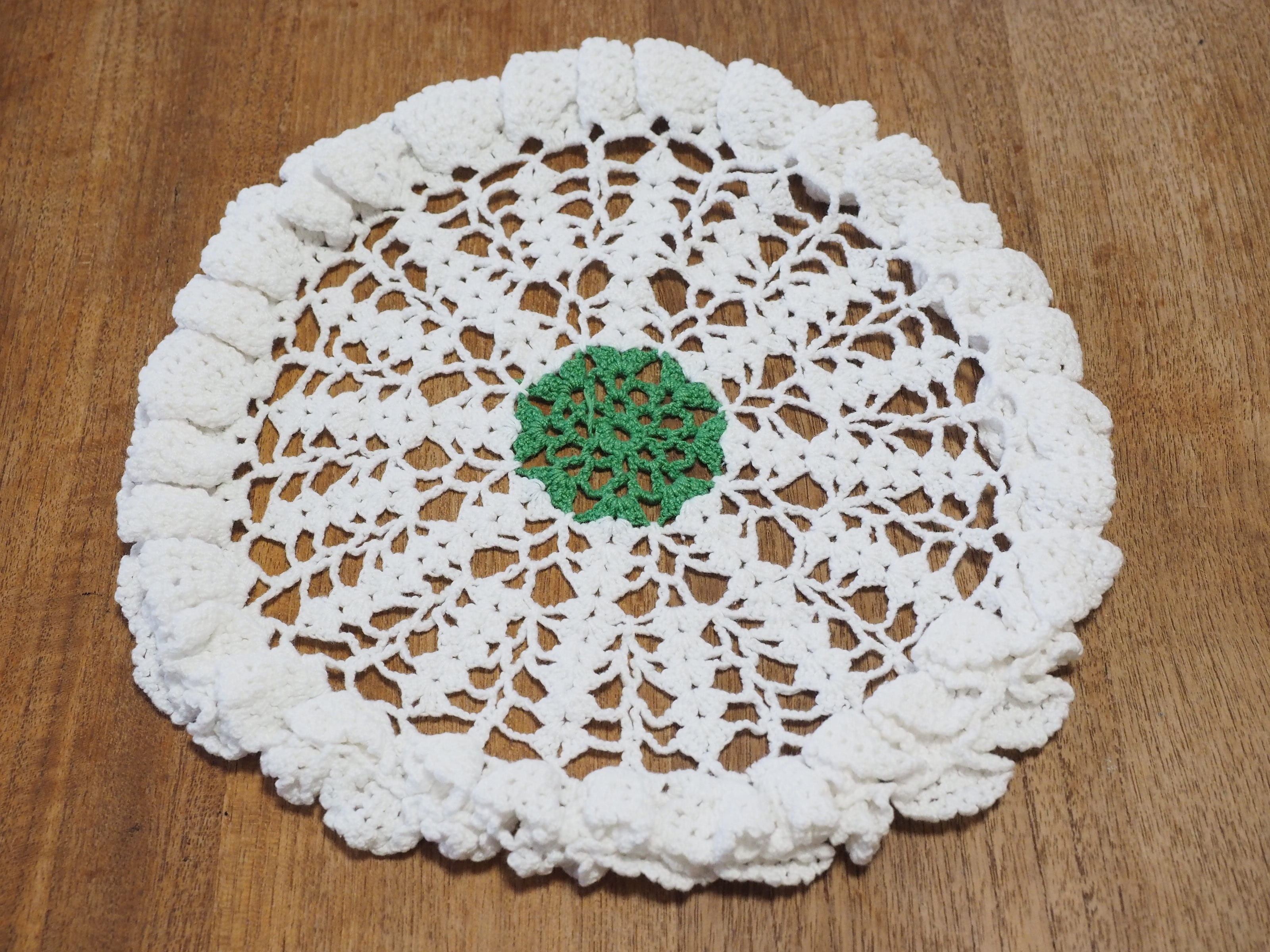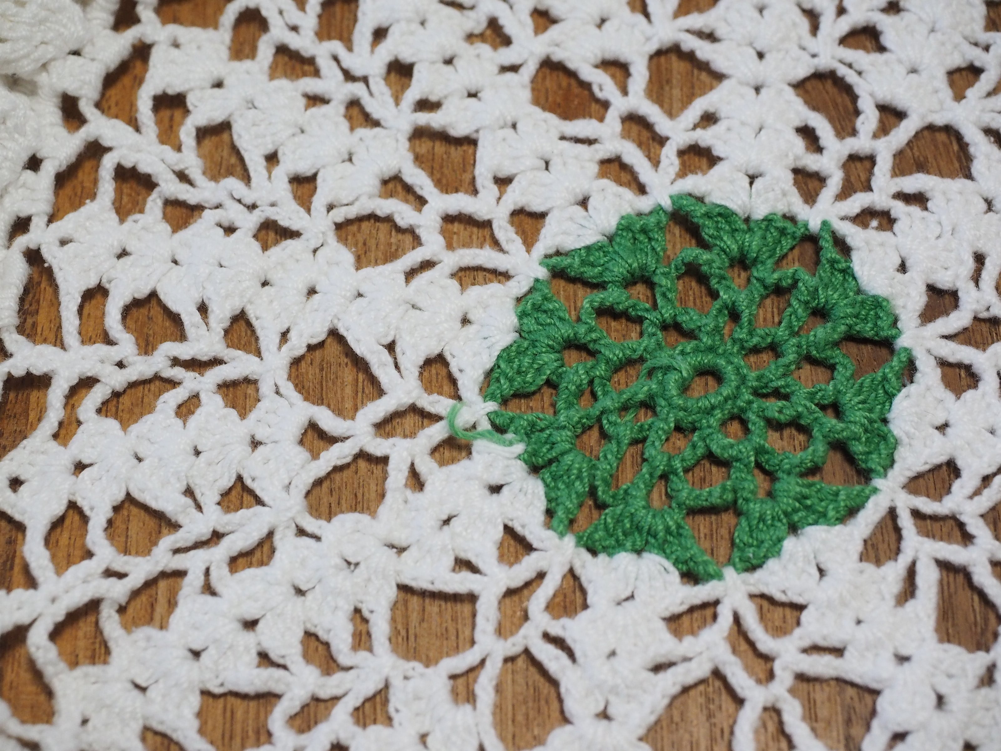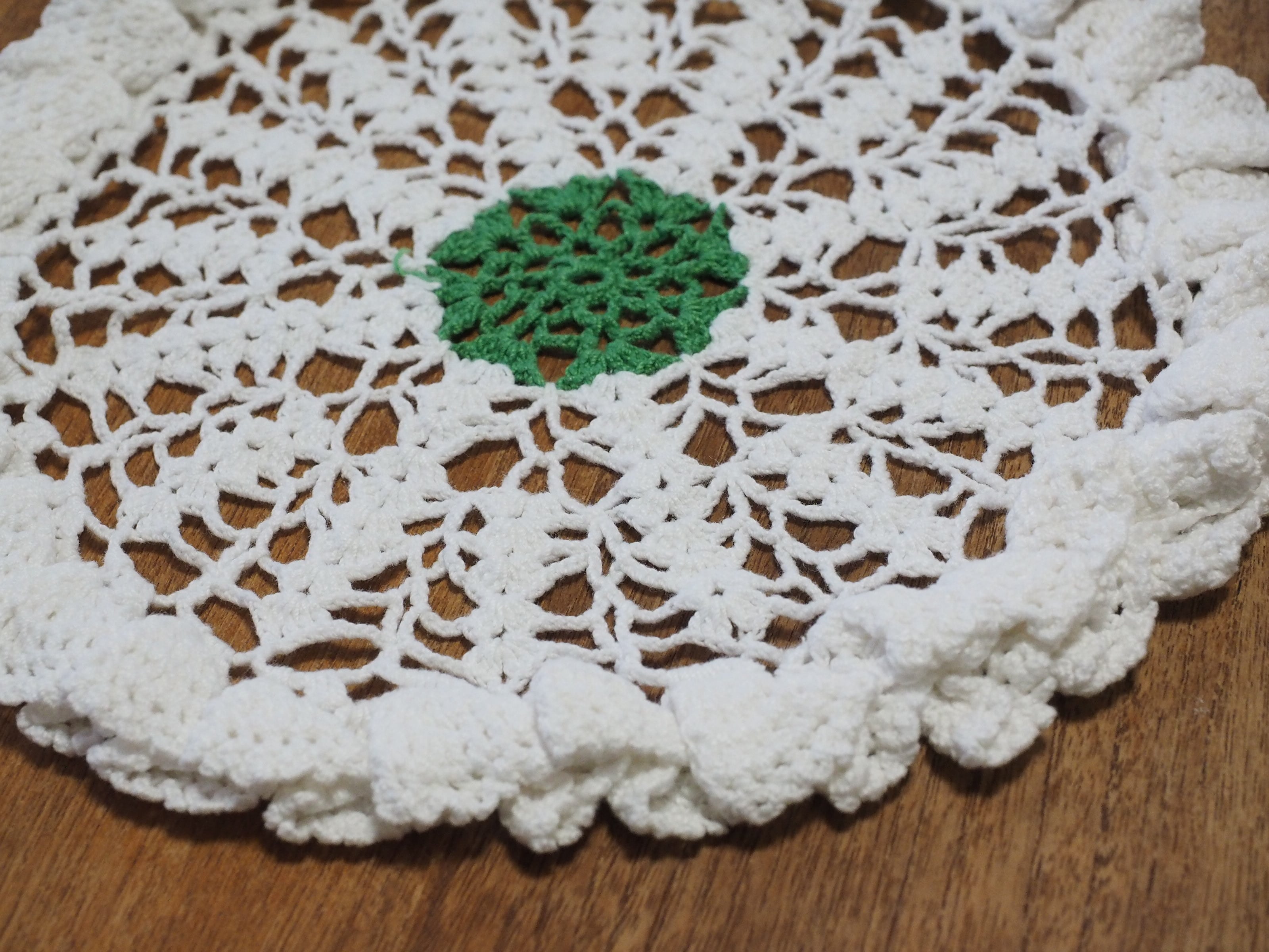 クロシェの模様、ホワイトとグリーンの色合いが素敵でぱっと明るい雰囲気に。