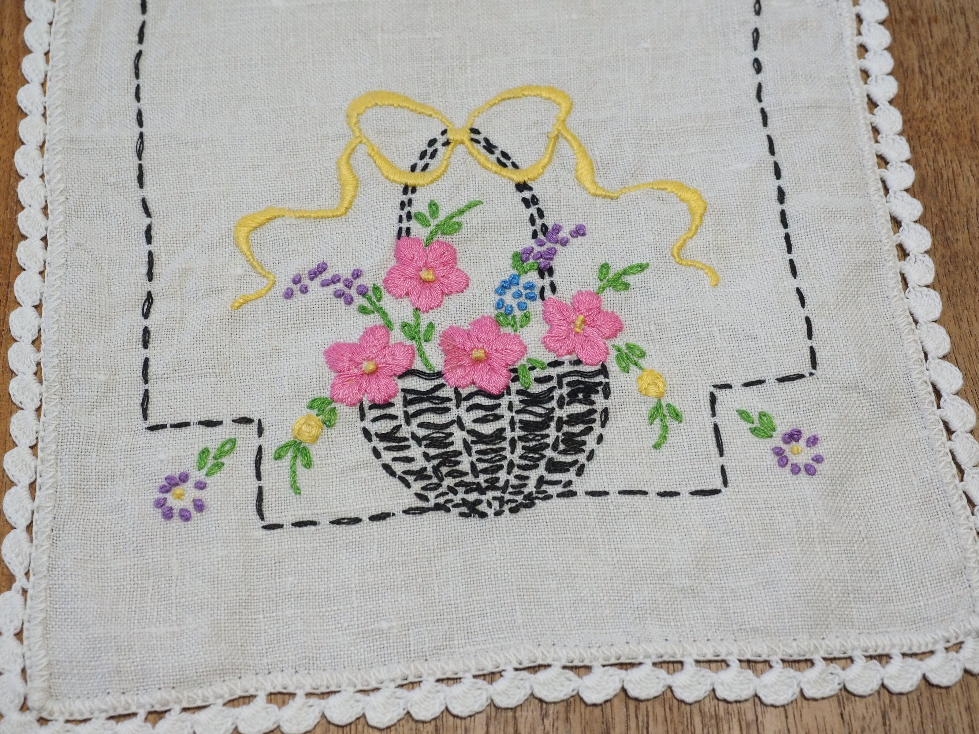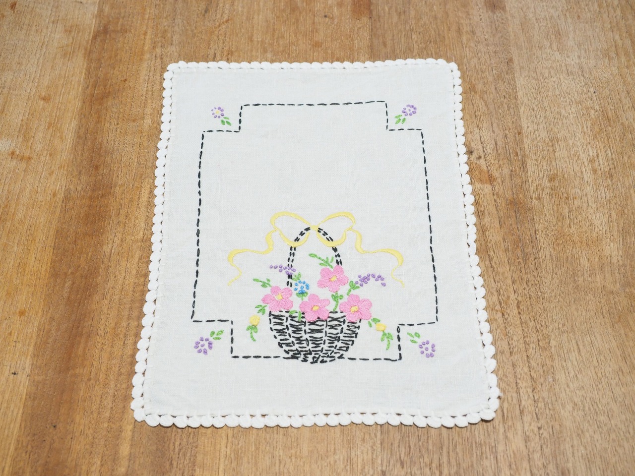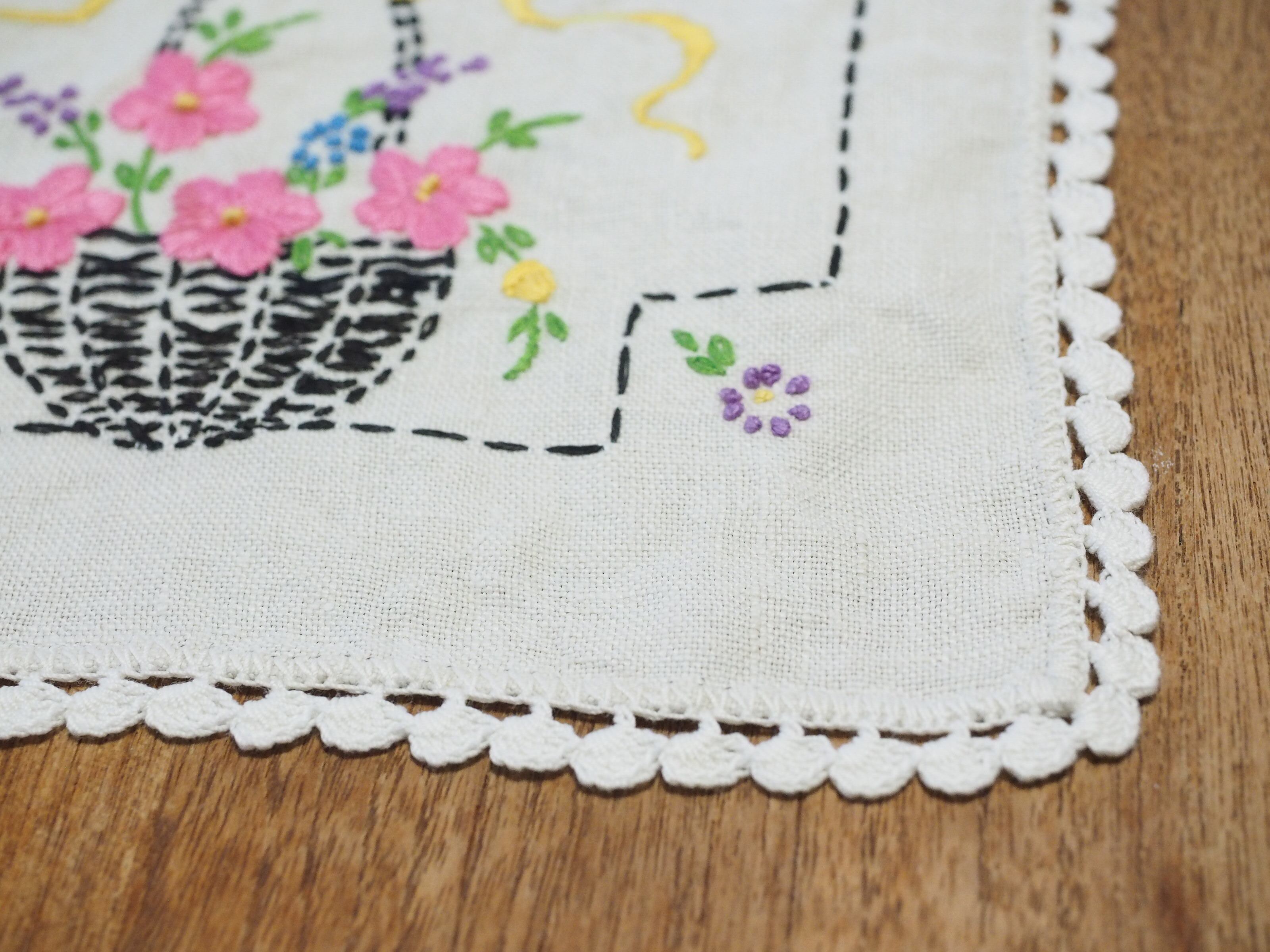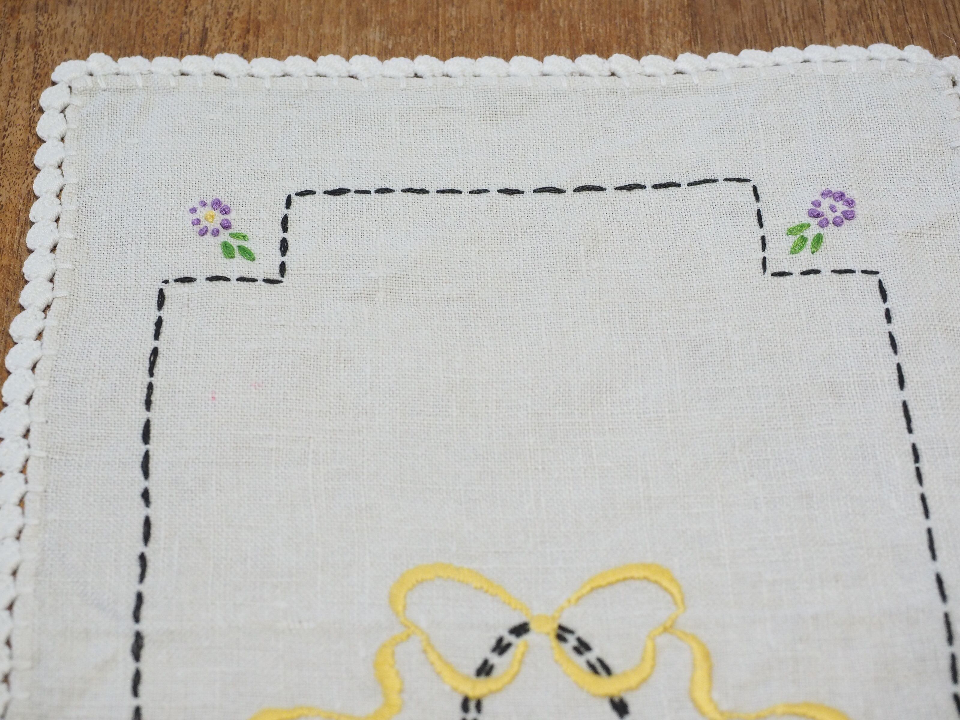 刺繍は花籠とお花、黄色のリボンと黒いステッチがアクセントになっています。