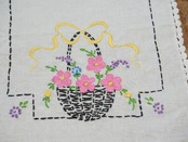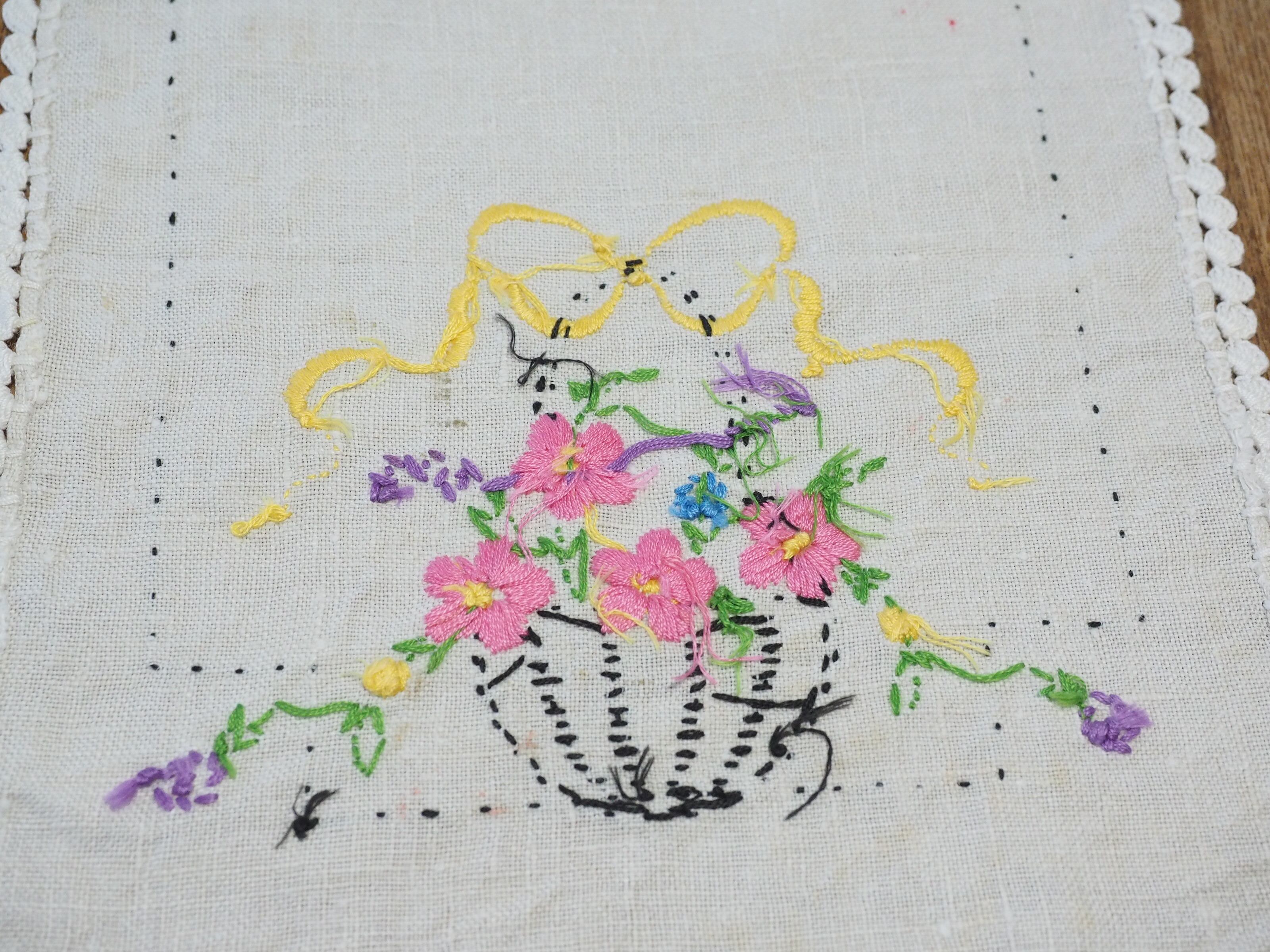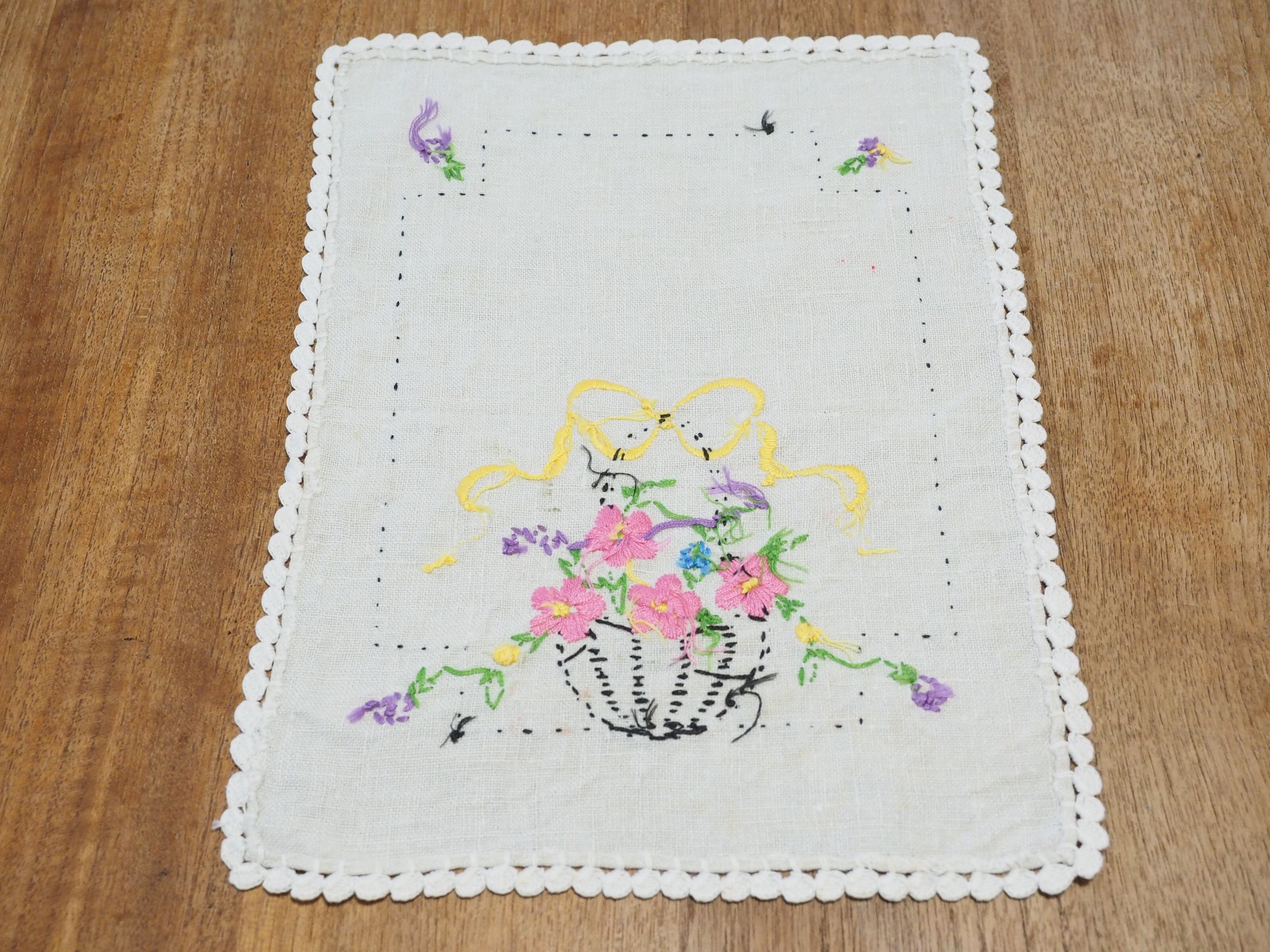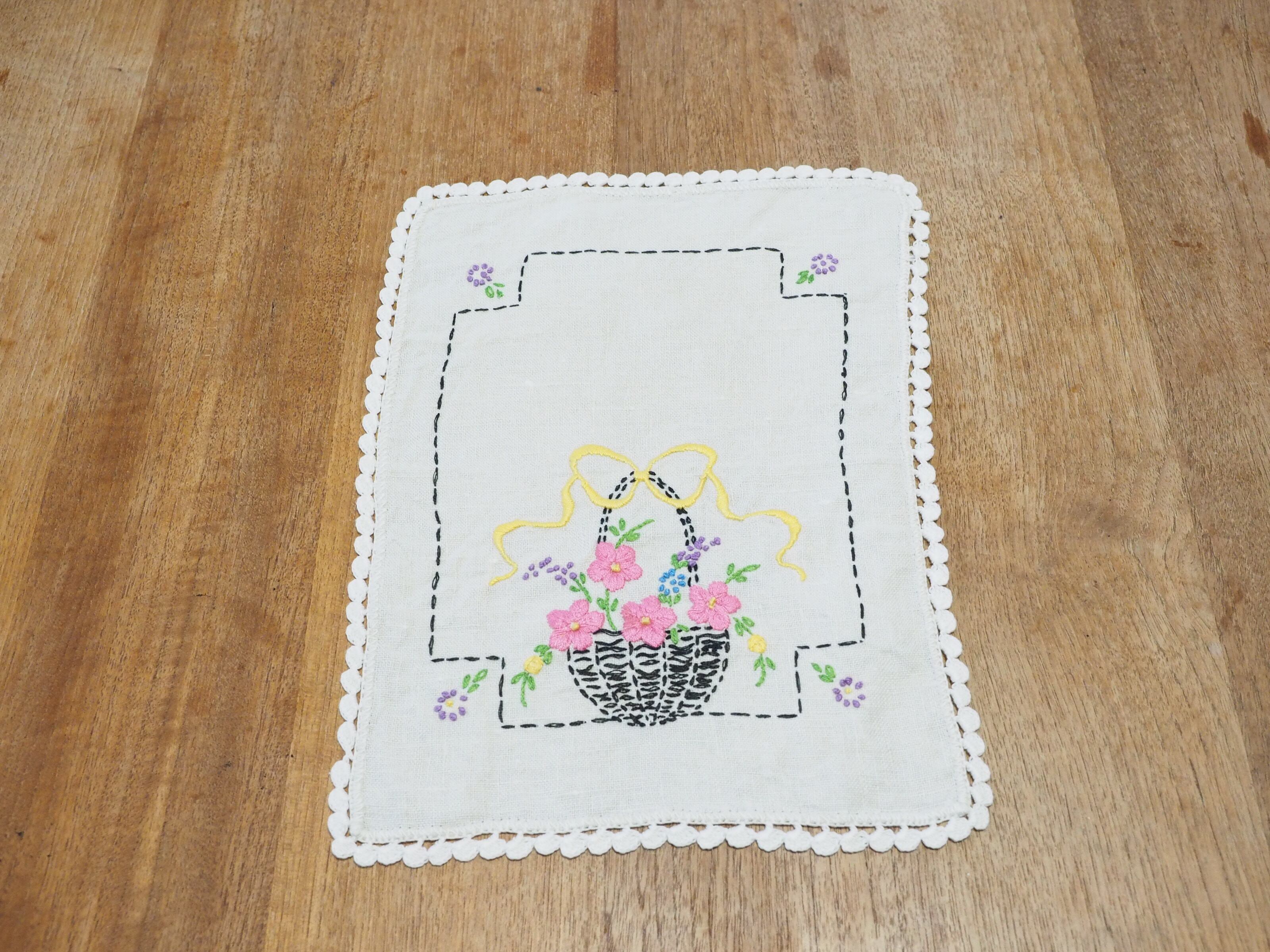 刺繍は花籠とお花、黄色のリボンと黒いステッチがアクセントになっています。