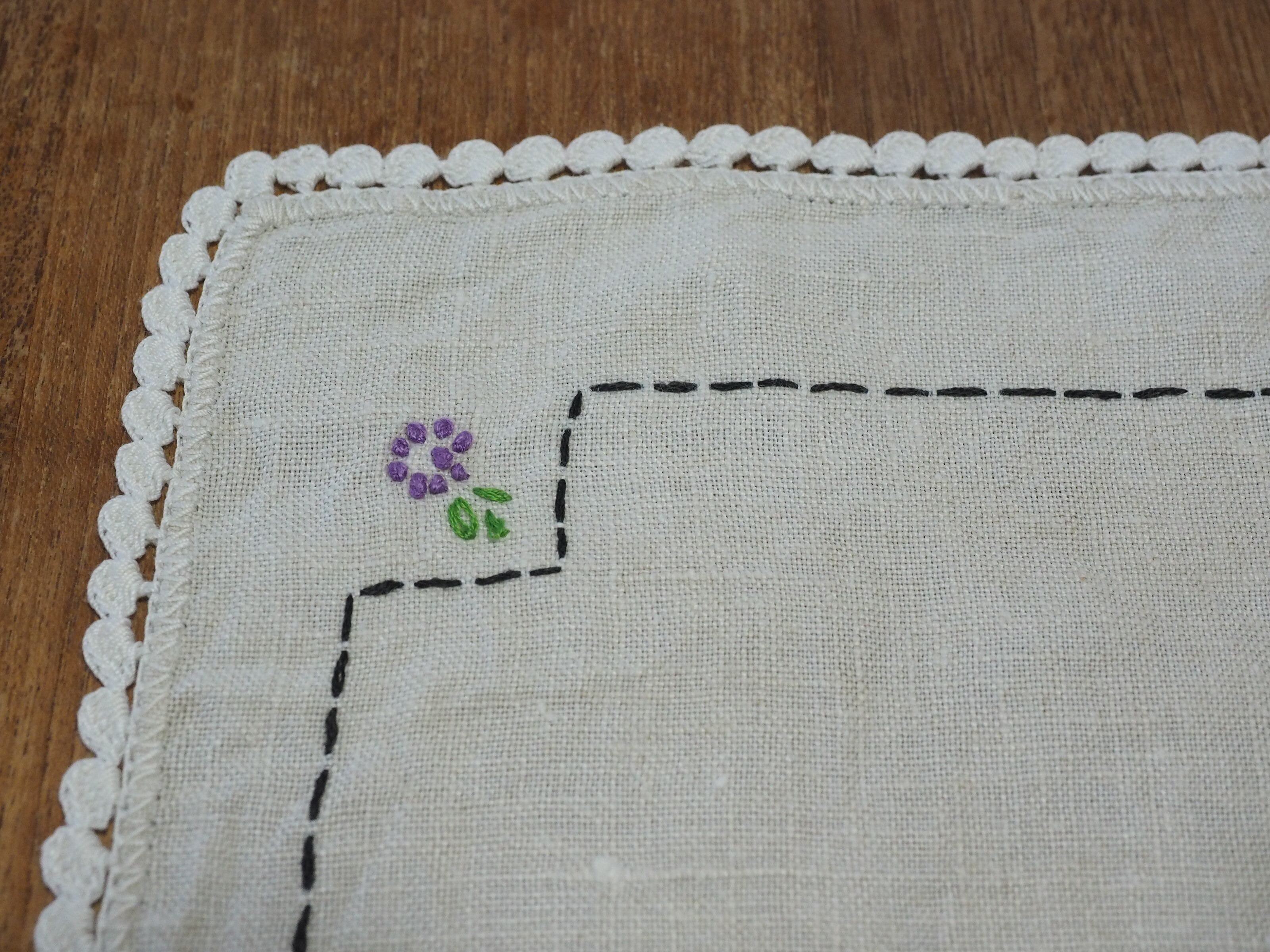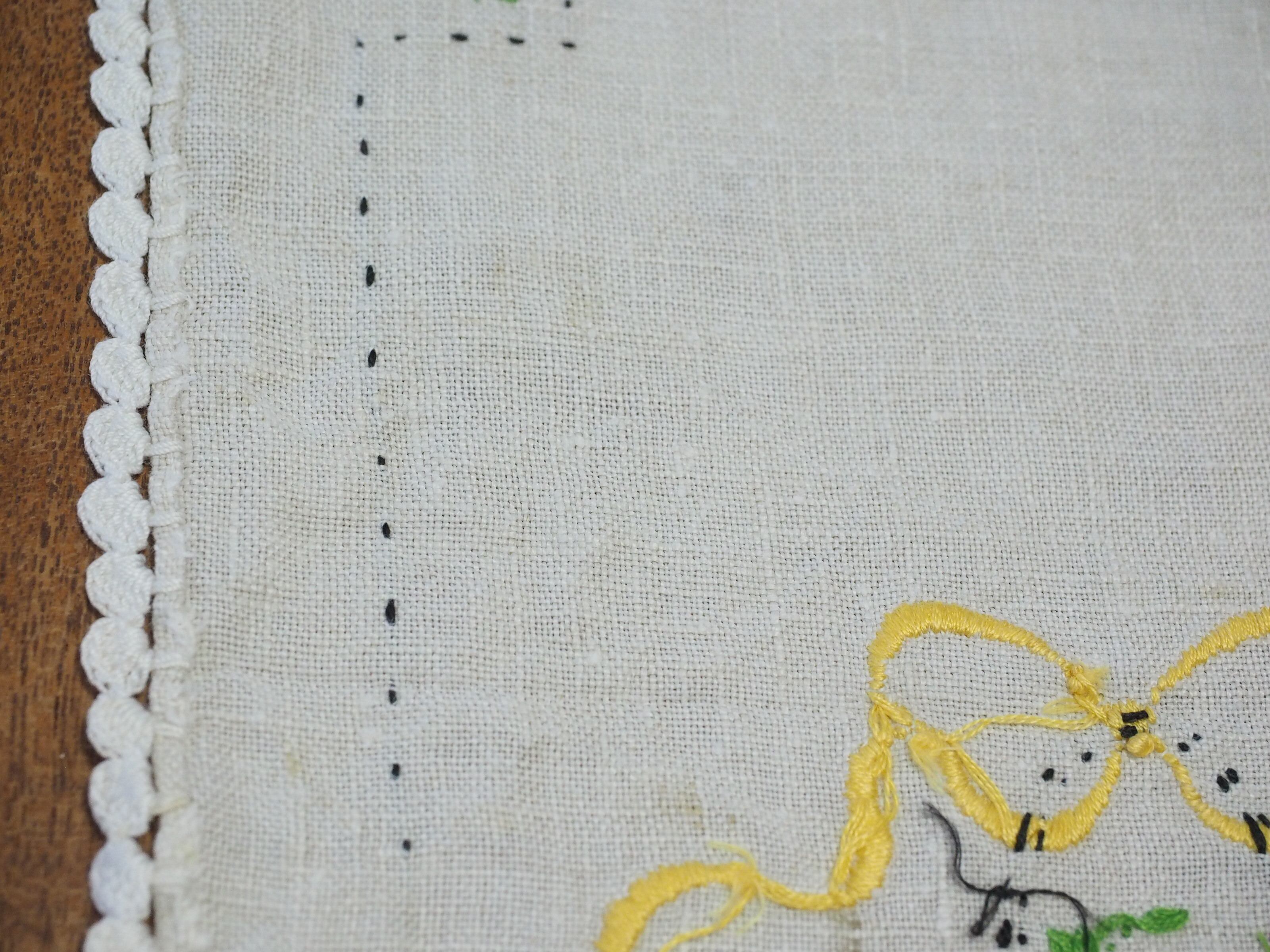 *生地がベージュで分かり辛いのですが、薄く茶色がかったシミがあり、1枚は糸の一部にピンクの糸が混ざった部分がございます。2枚からランダムでお送りいたします。