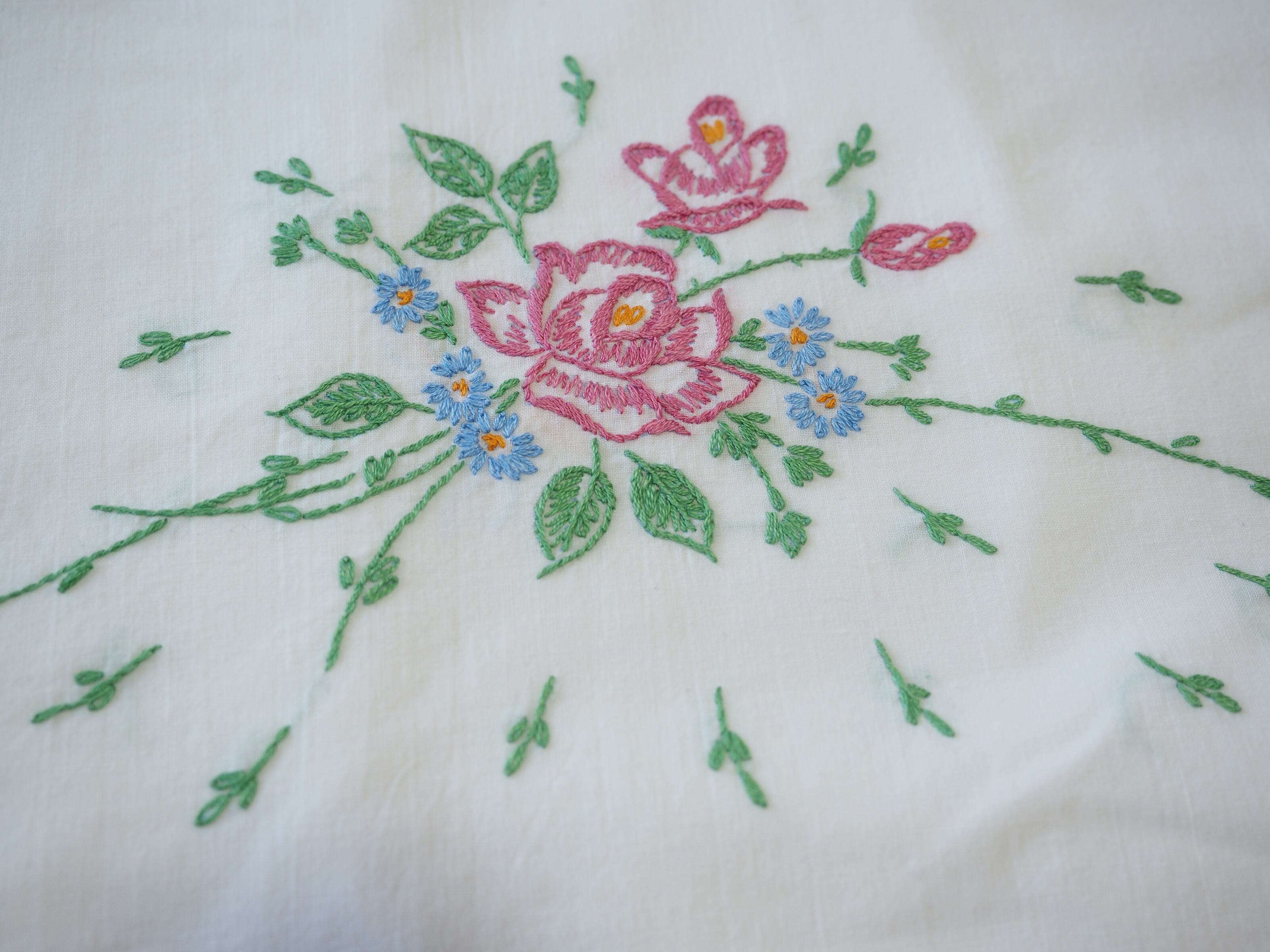 刺繍の下と、一番右手に刺し忘れたと思われる青い下絵が残っています。