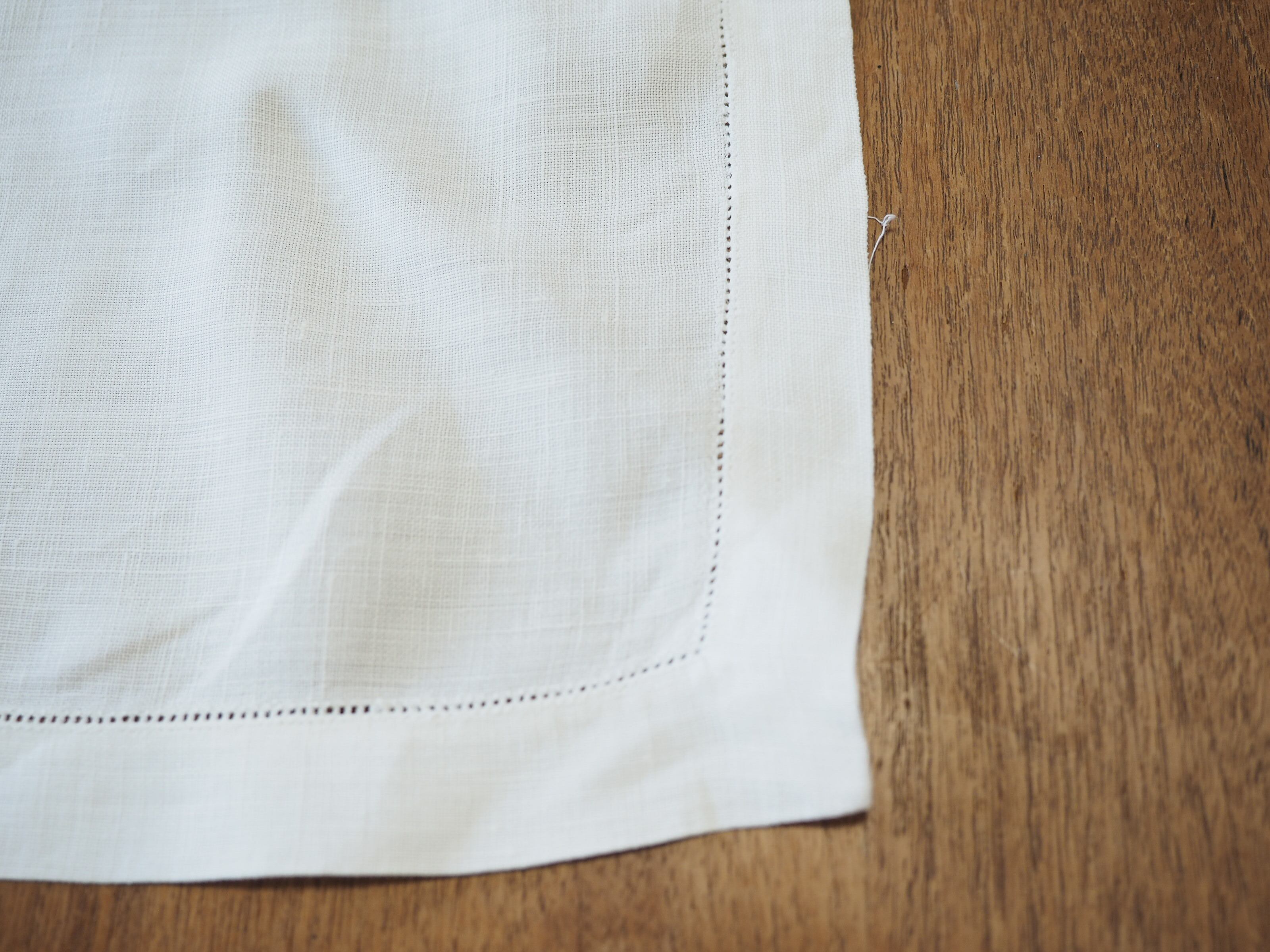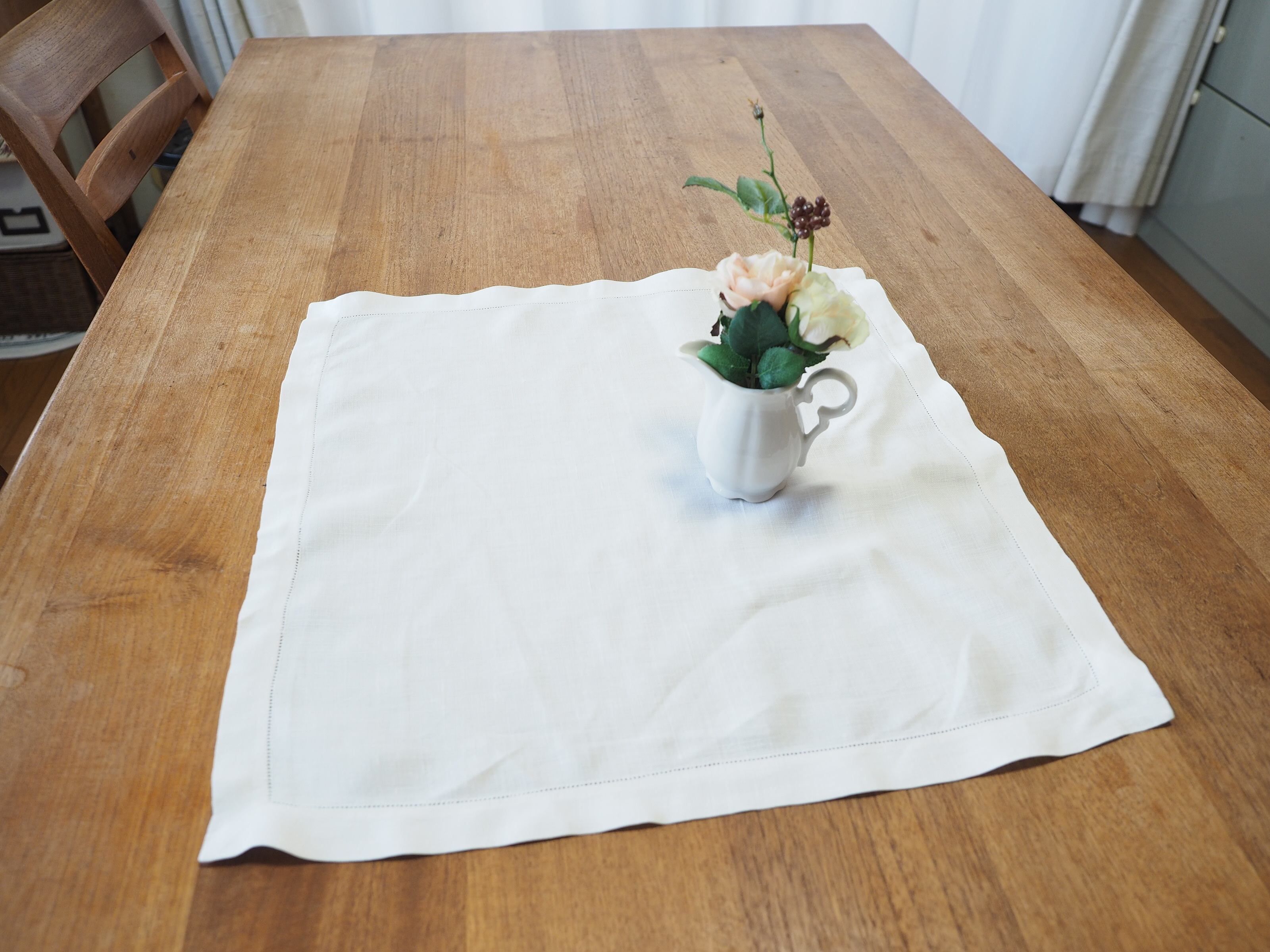 とてもシンプルなドロンワークのみですが、手仕事の細やかさが美しく、ポイントになります。