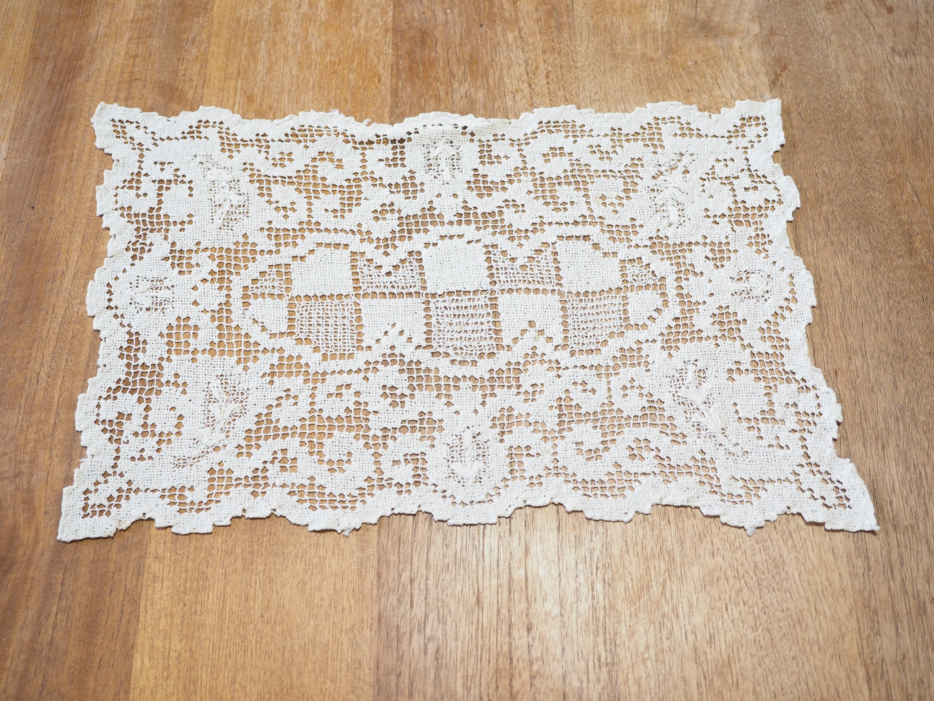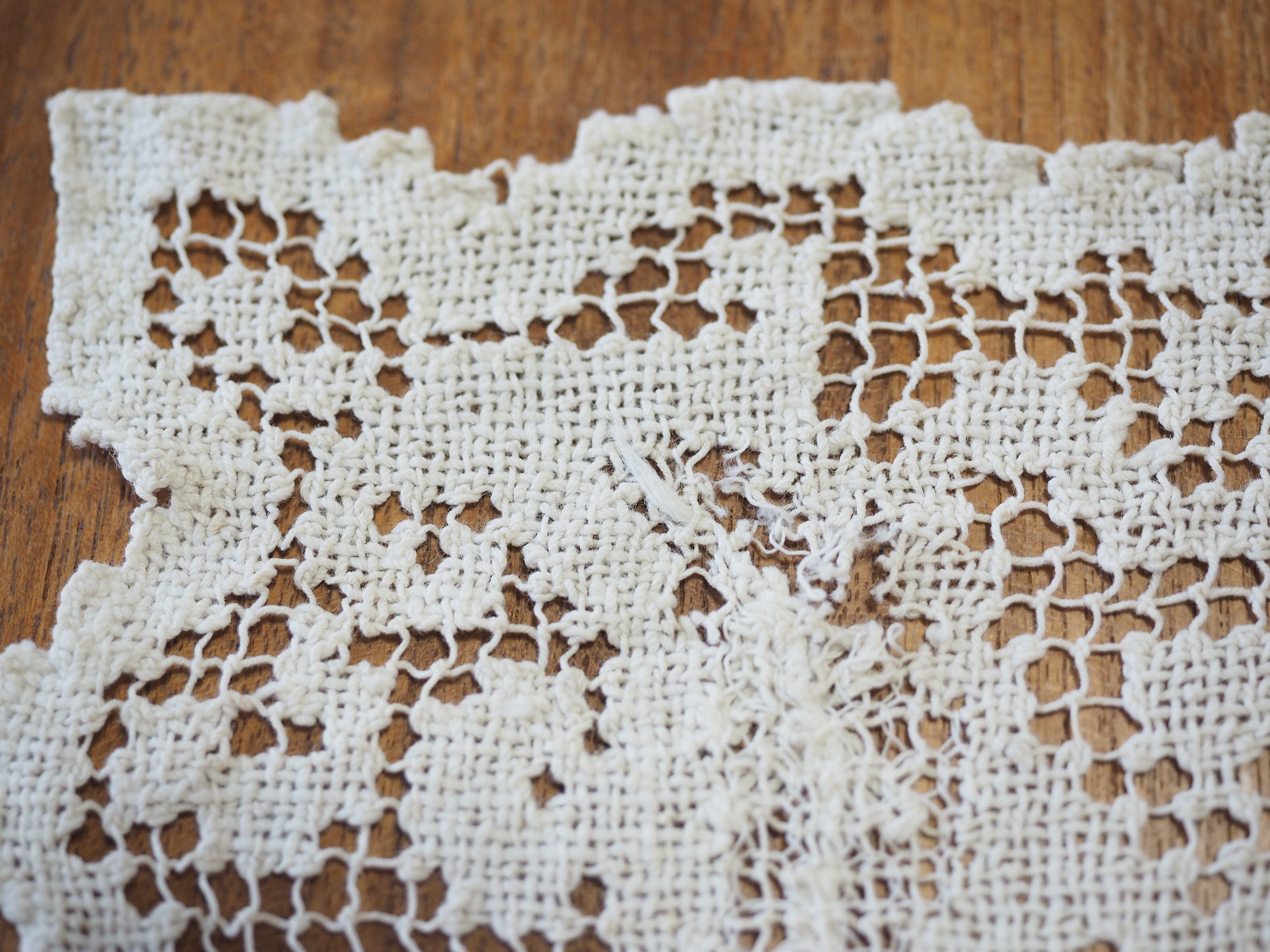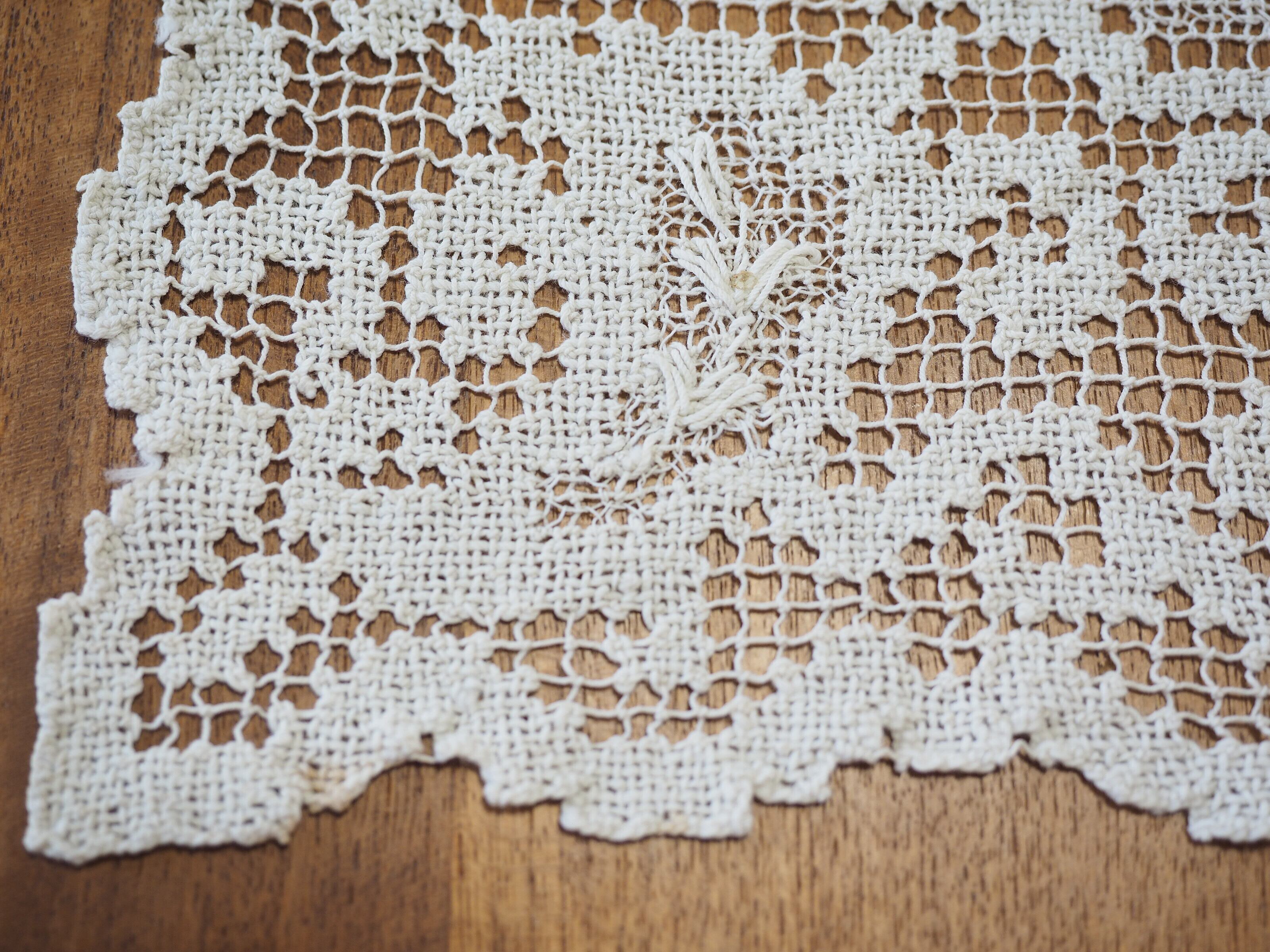 *細い糸のモチーフを繋ぐ部分に破れ、ところどころ茶色くシミがございます。