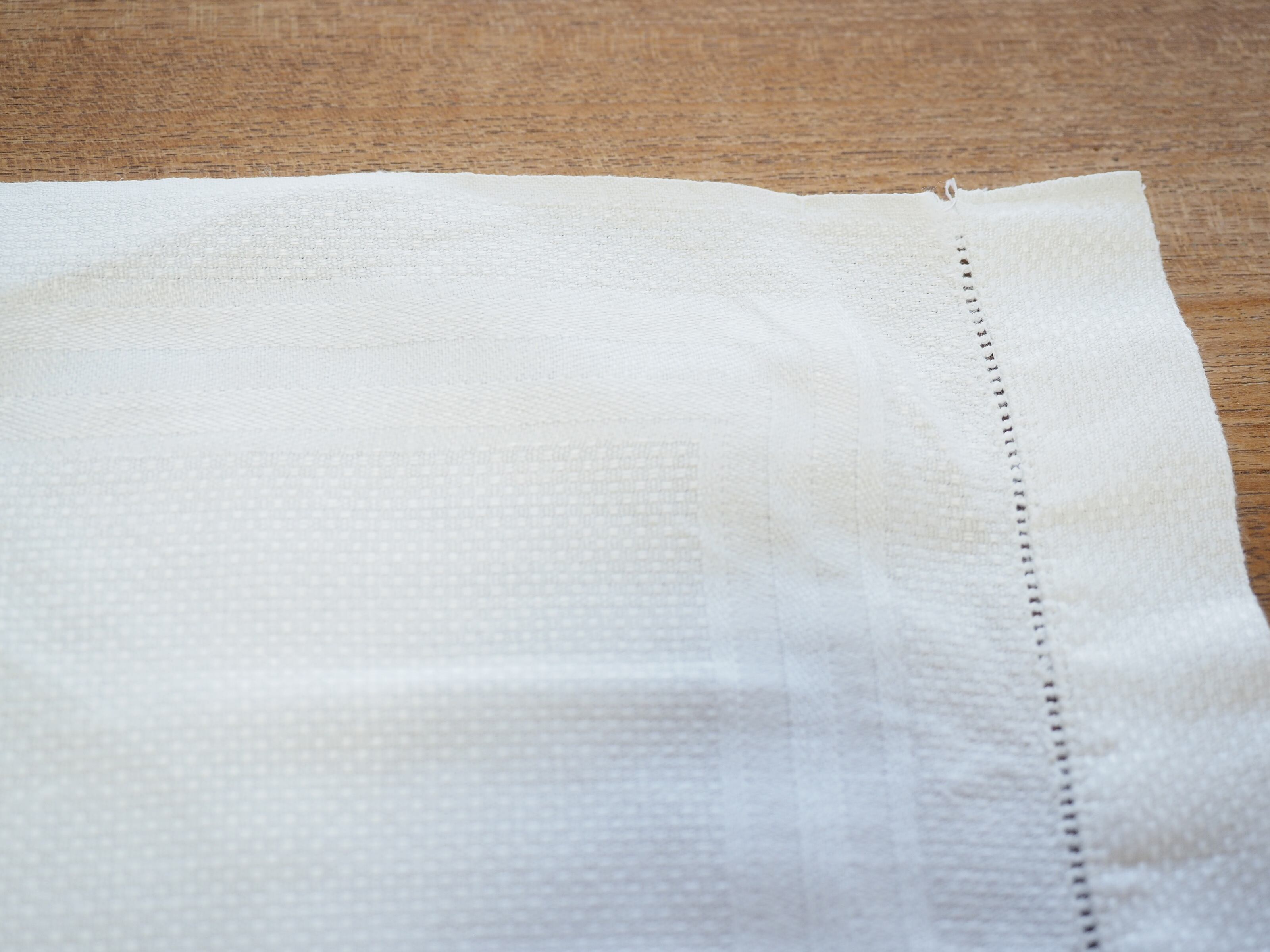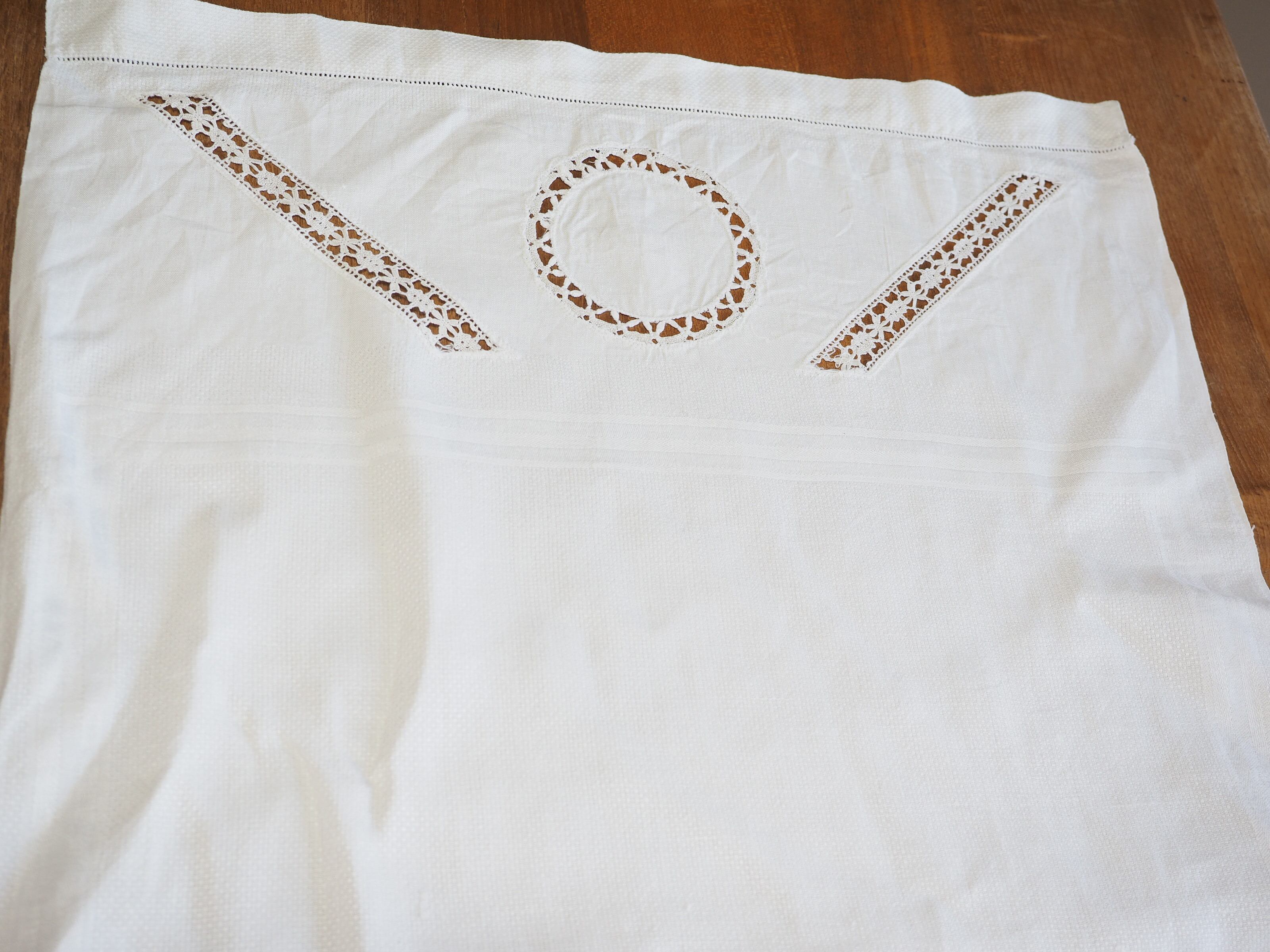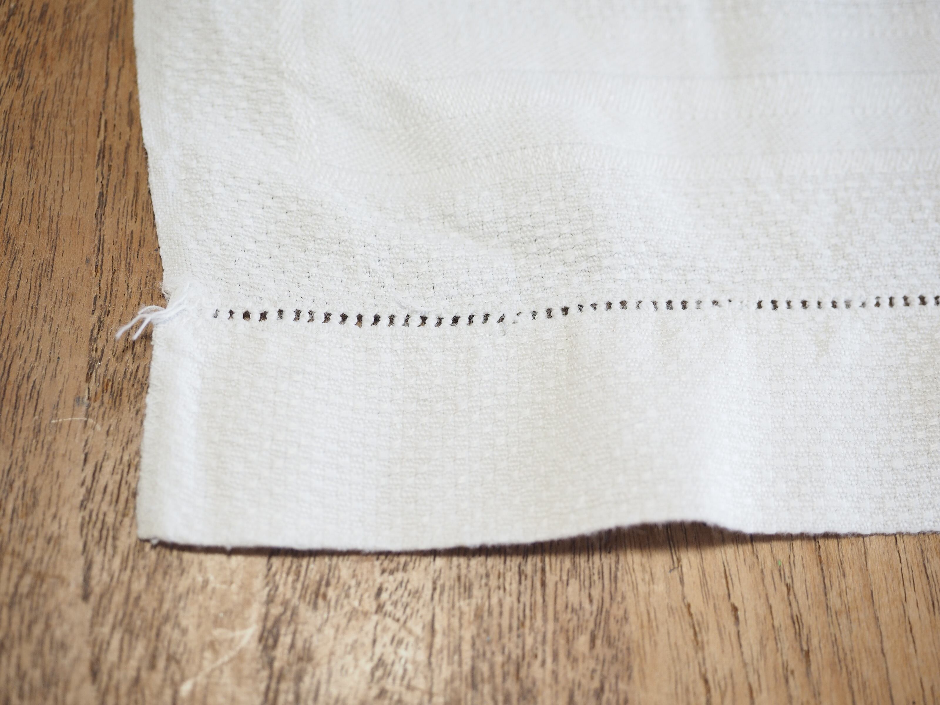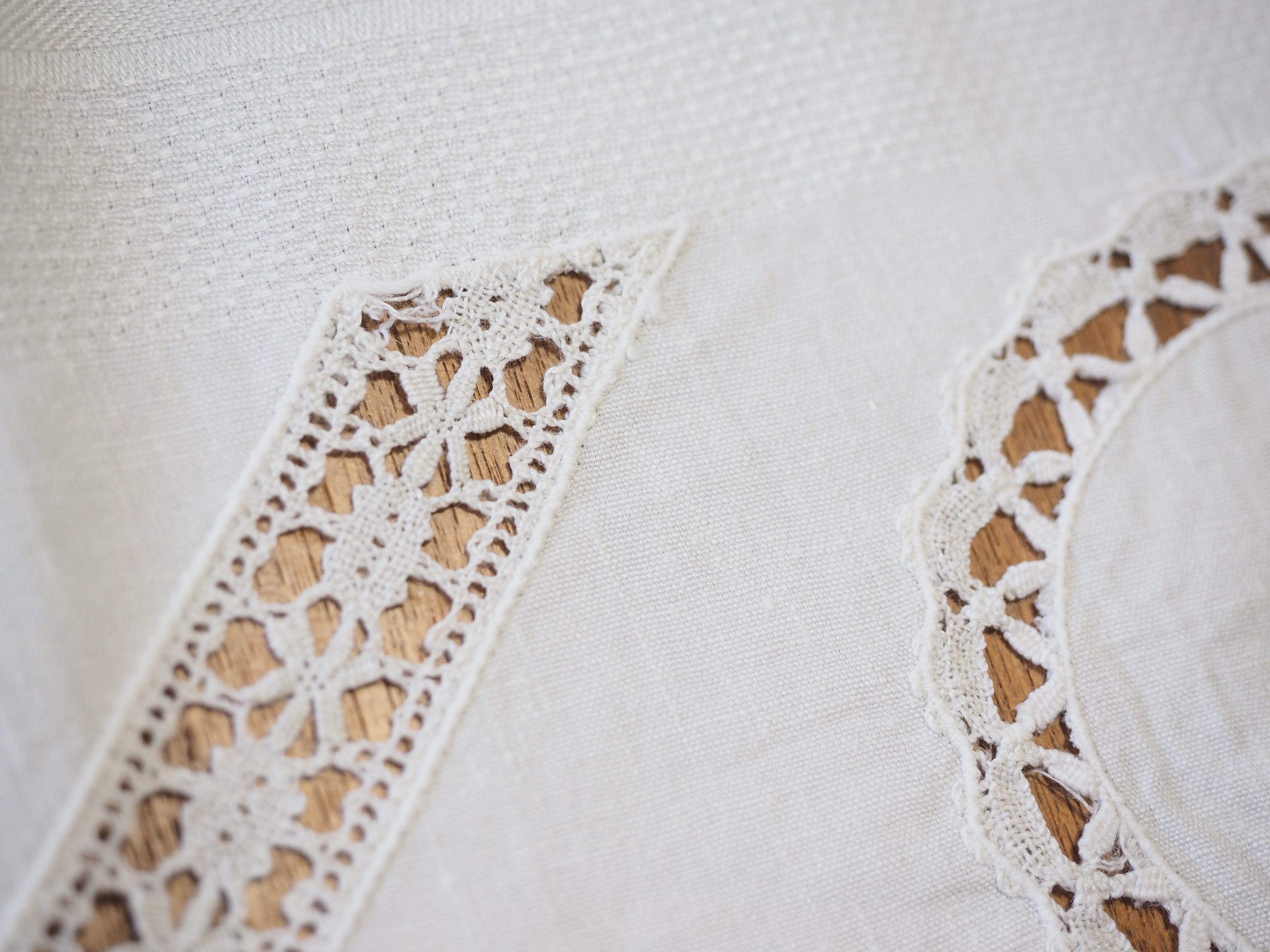 シンプルですが、織り地にストライプのような模様が入っていて、レースやドロンワークでかわいらしさが加えられています。