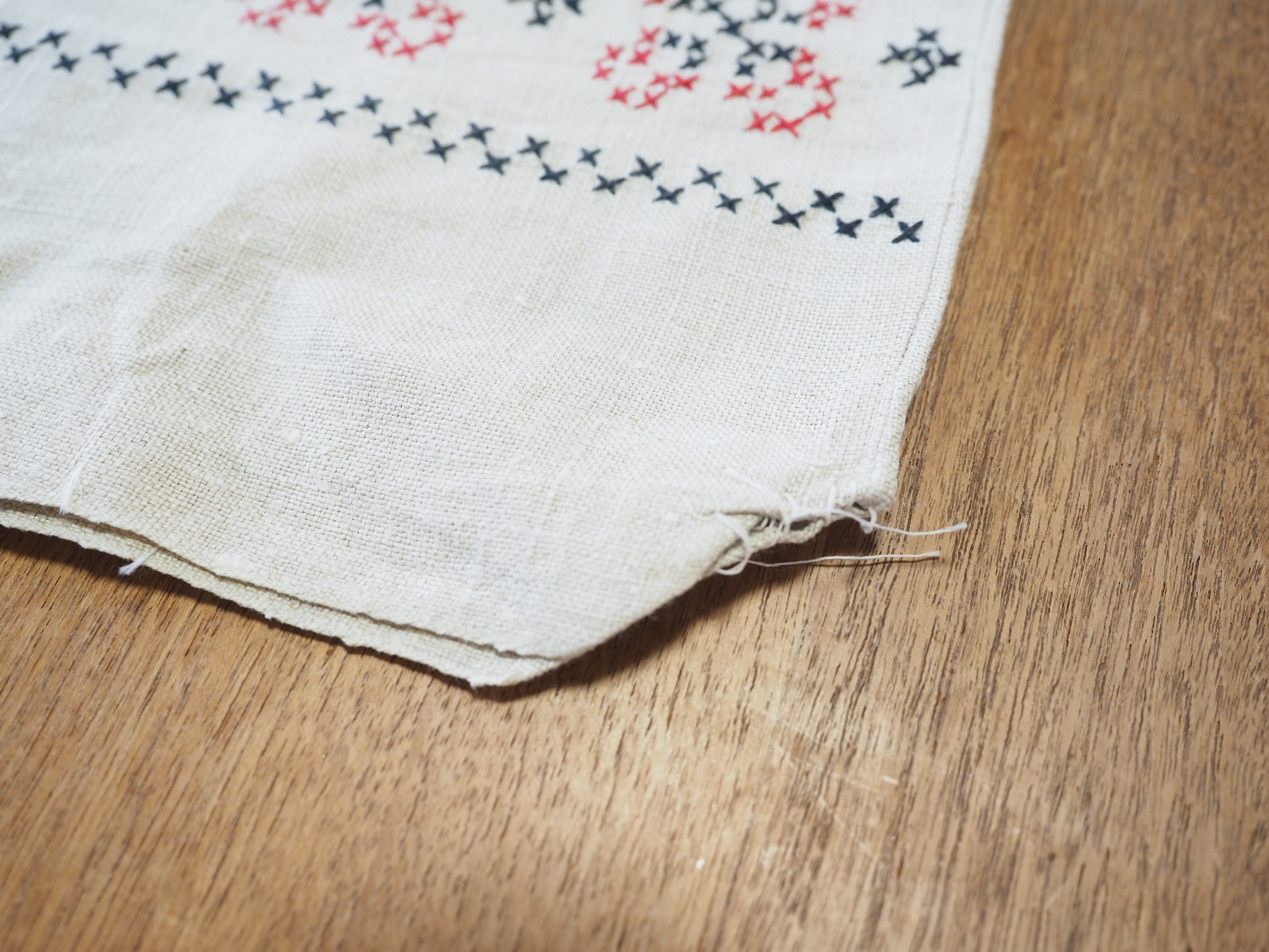 サイドはミシン縫いですが、クッションの入れ口の左右が手縫いされていて、縫い目が大きくほつれています。