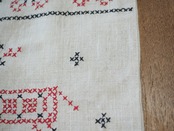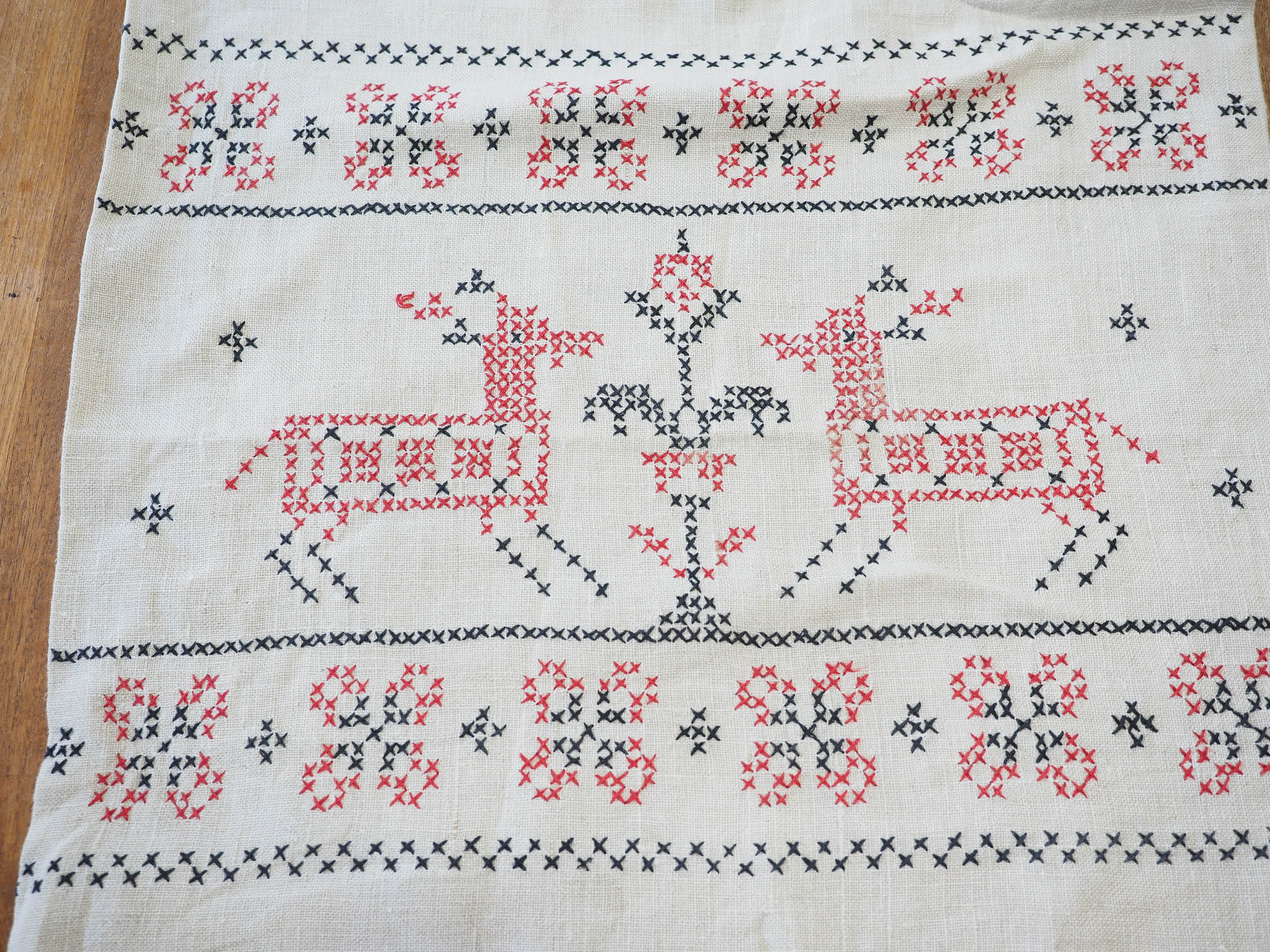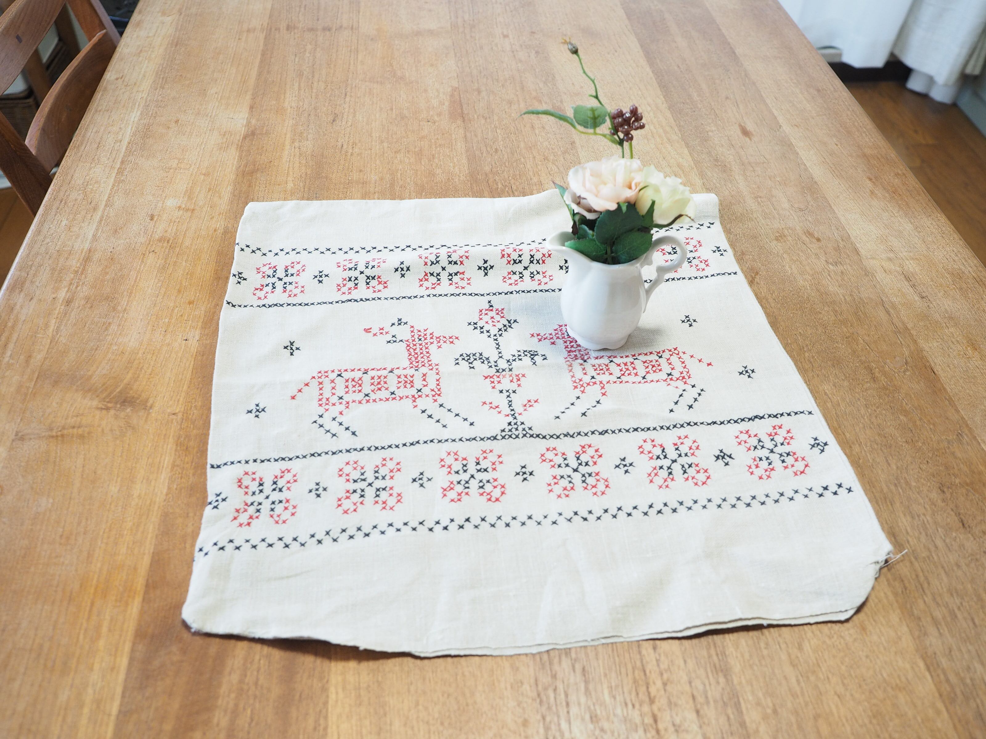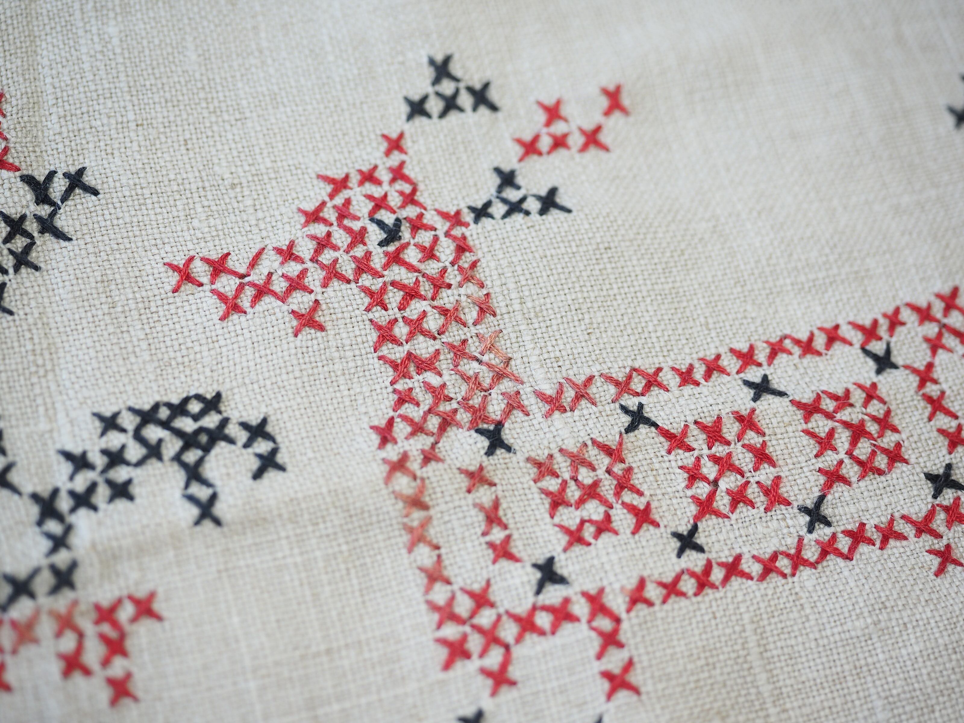 ざっくりした大き目のクロスステッチで、赤と黒の刺繍がシンプルで素朴なかわいらしさです。