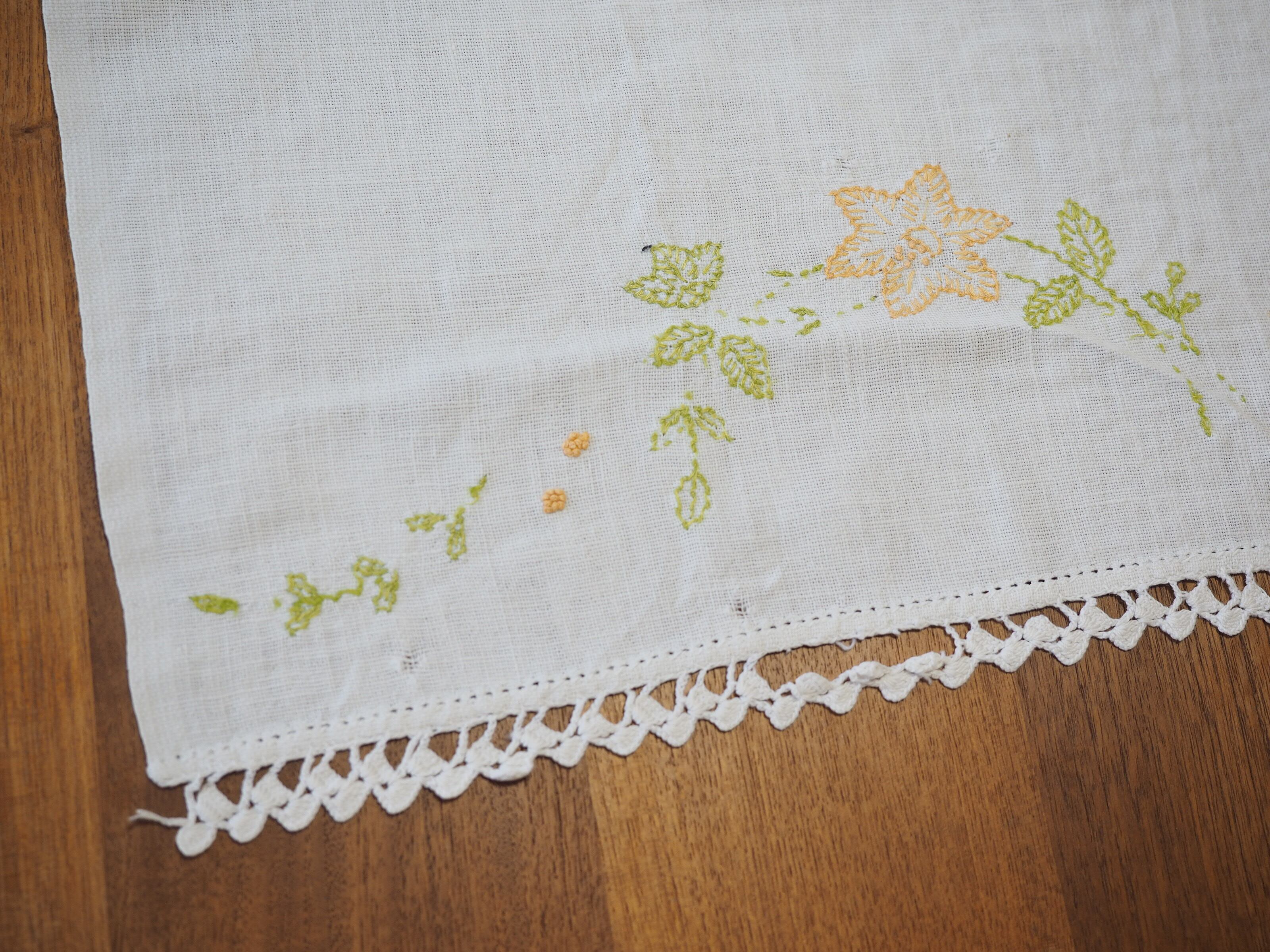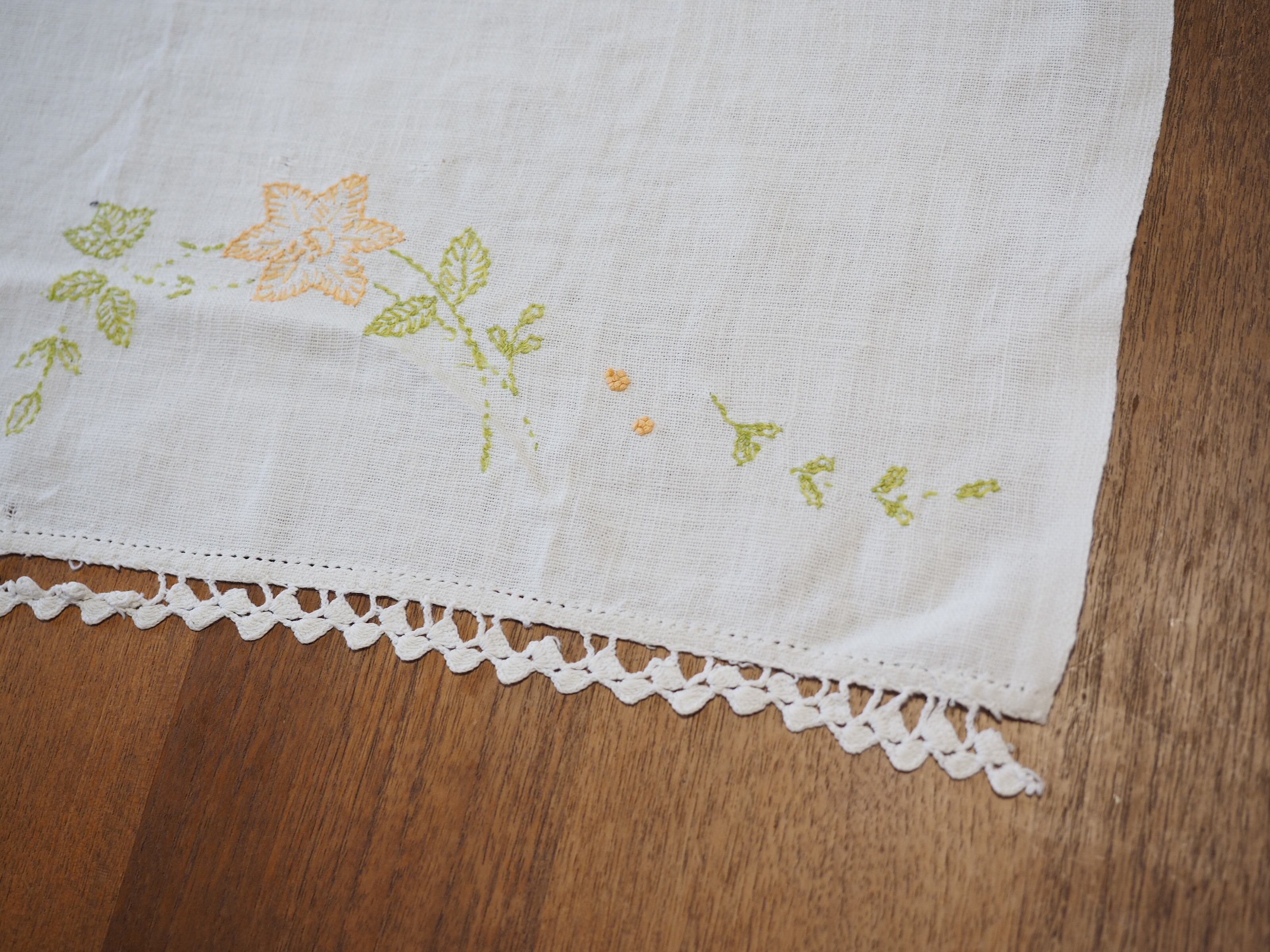 小さな葉っぱが重なっていくように編まれた縁編みがかわいらしく、ふんわり浮かんだような葉と淡い山吹カラーのお花がアクセントになっています。