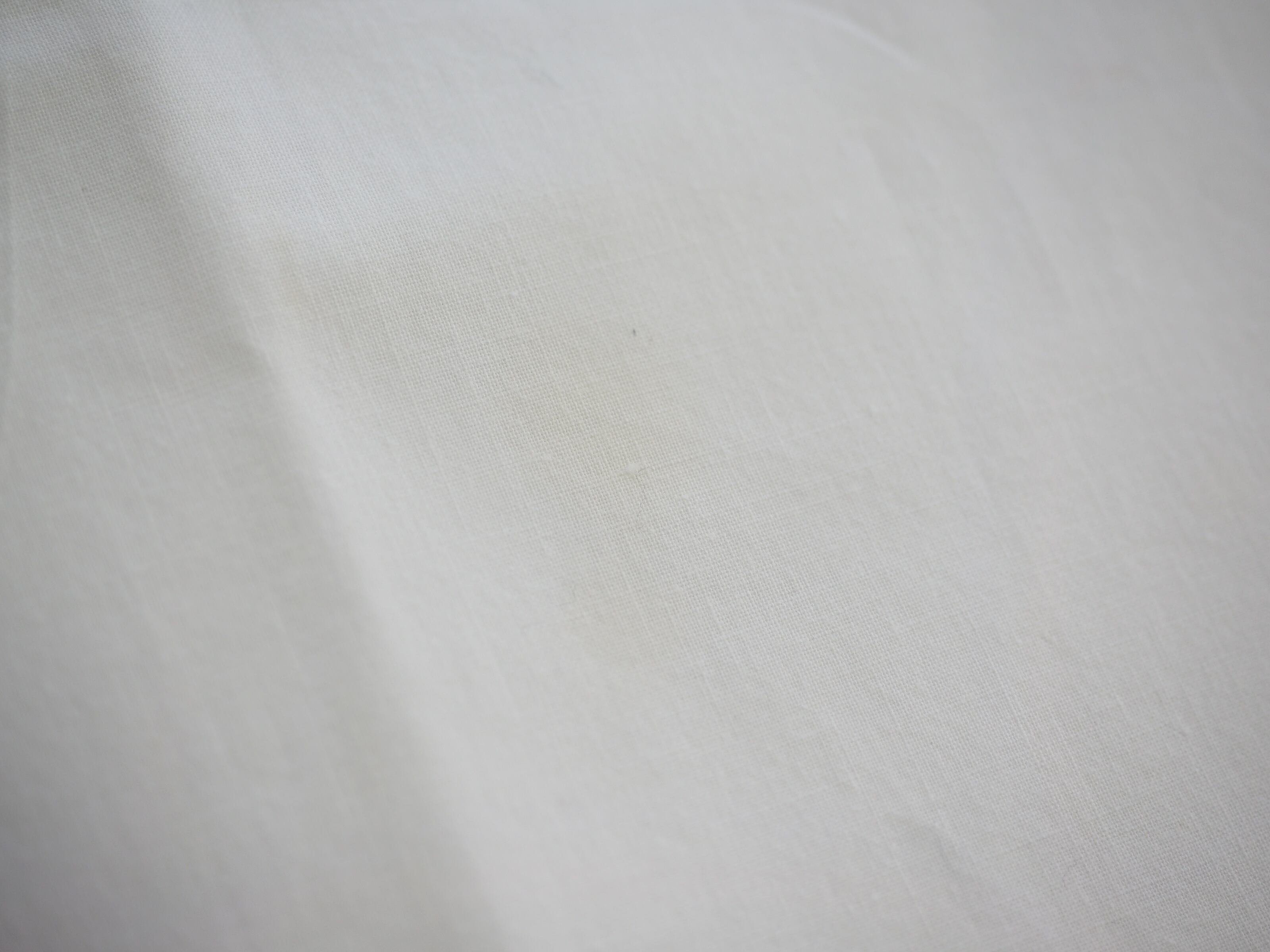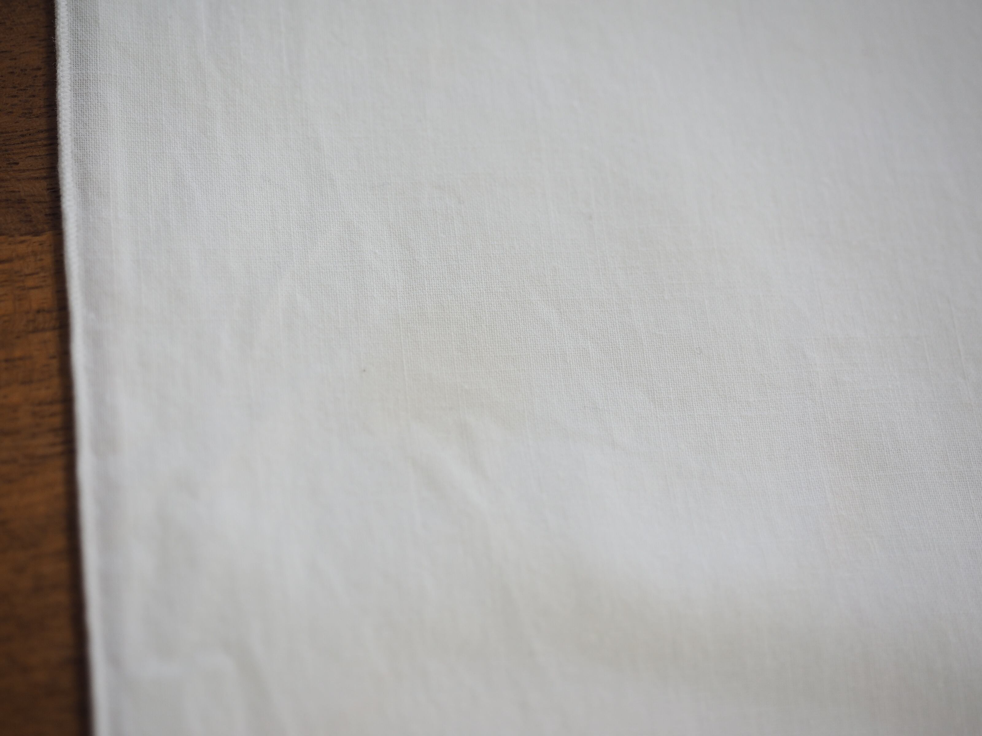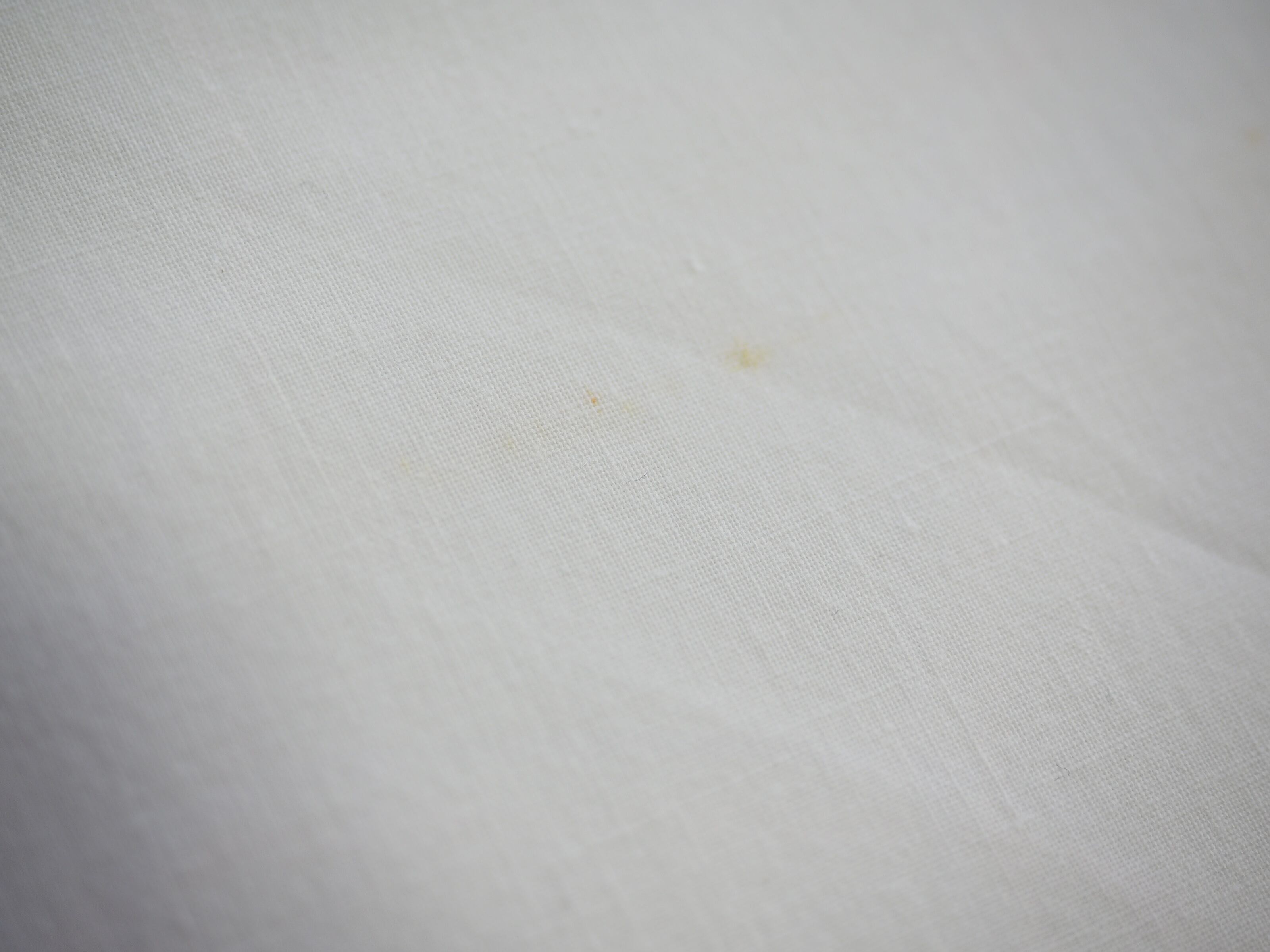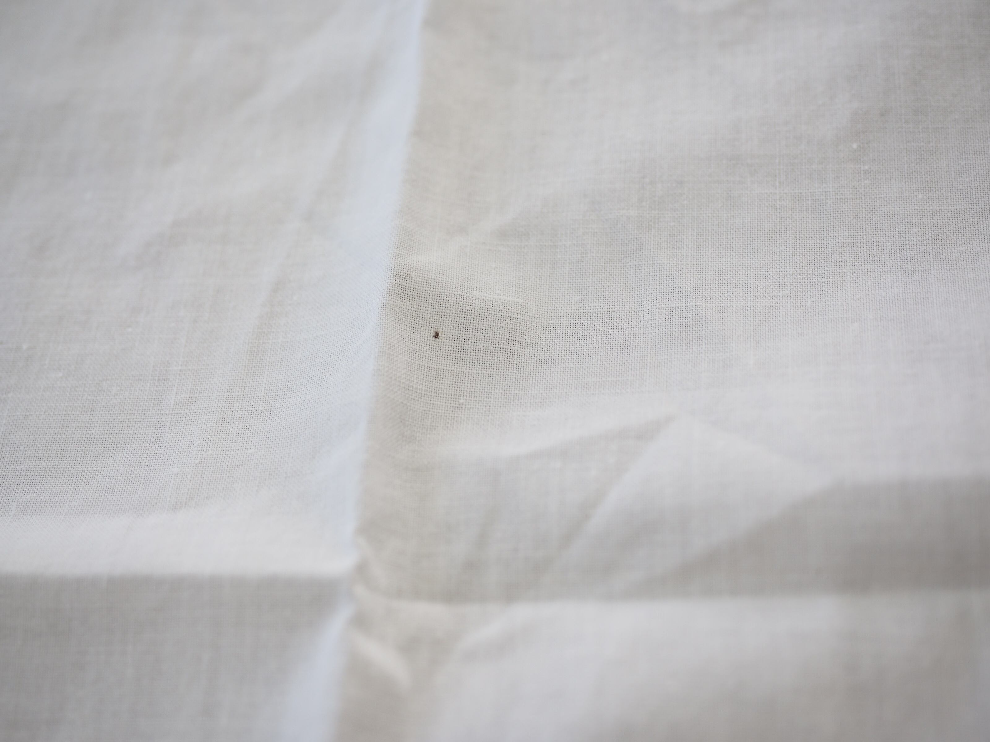 *テーブルの上だと分かり辛いのですが、生地を重ねると分かるうっすらした円状の大きなシミ、丸いシミ、楕円上のシミ、点々シミ、少し濃い目の点と線になった茶色のシミが合計5か所ございます。