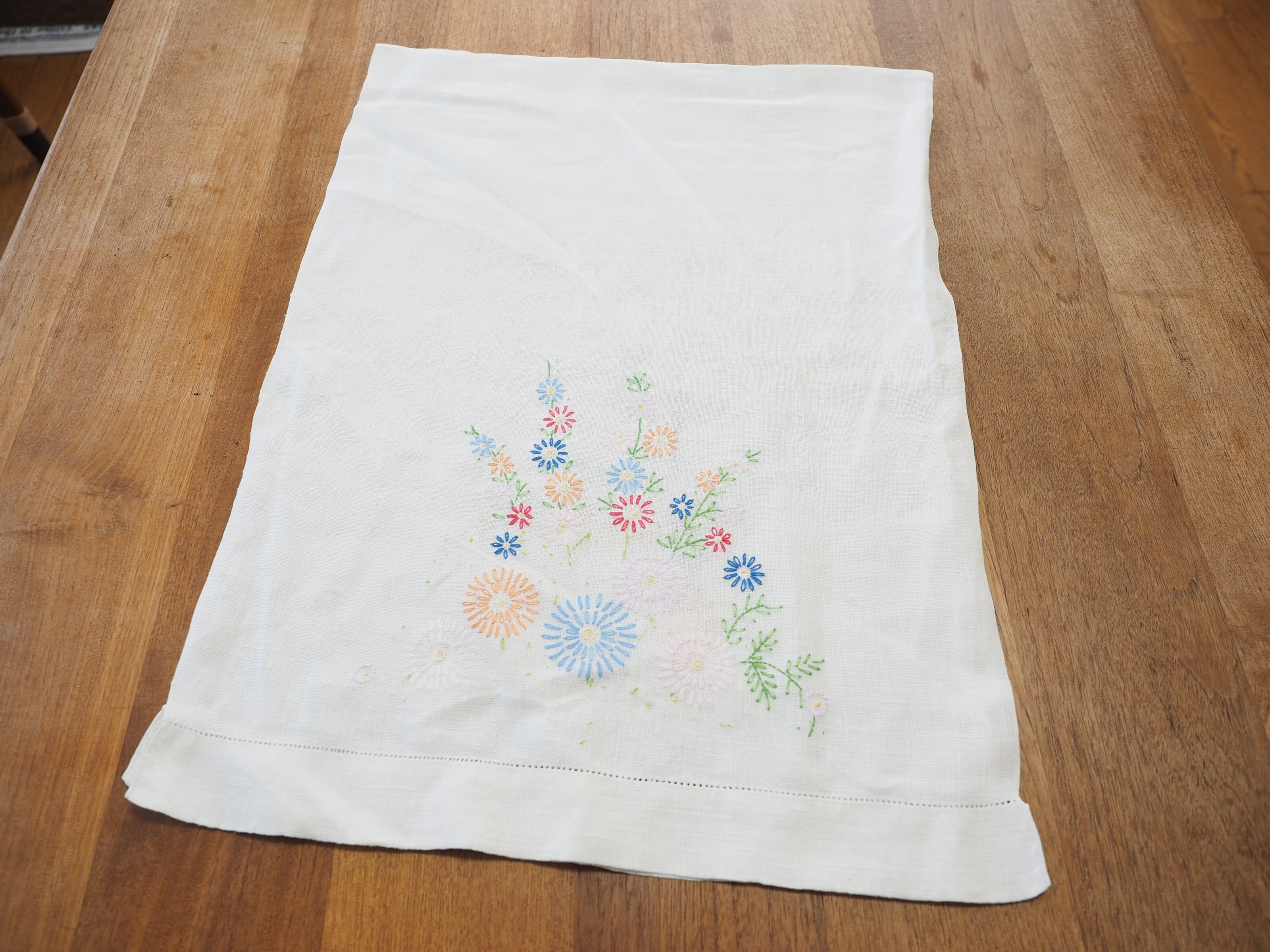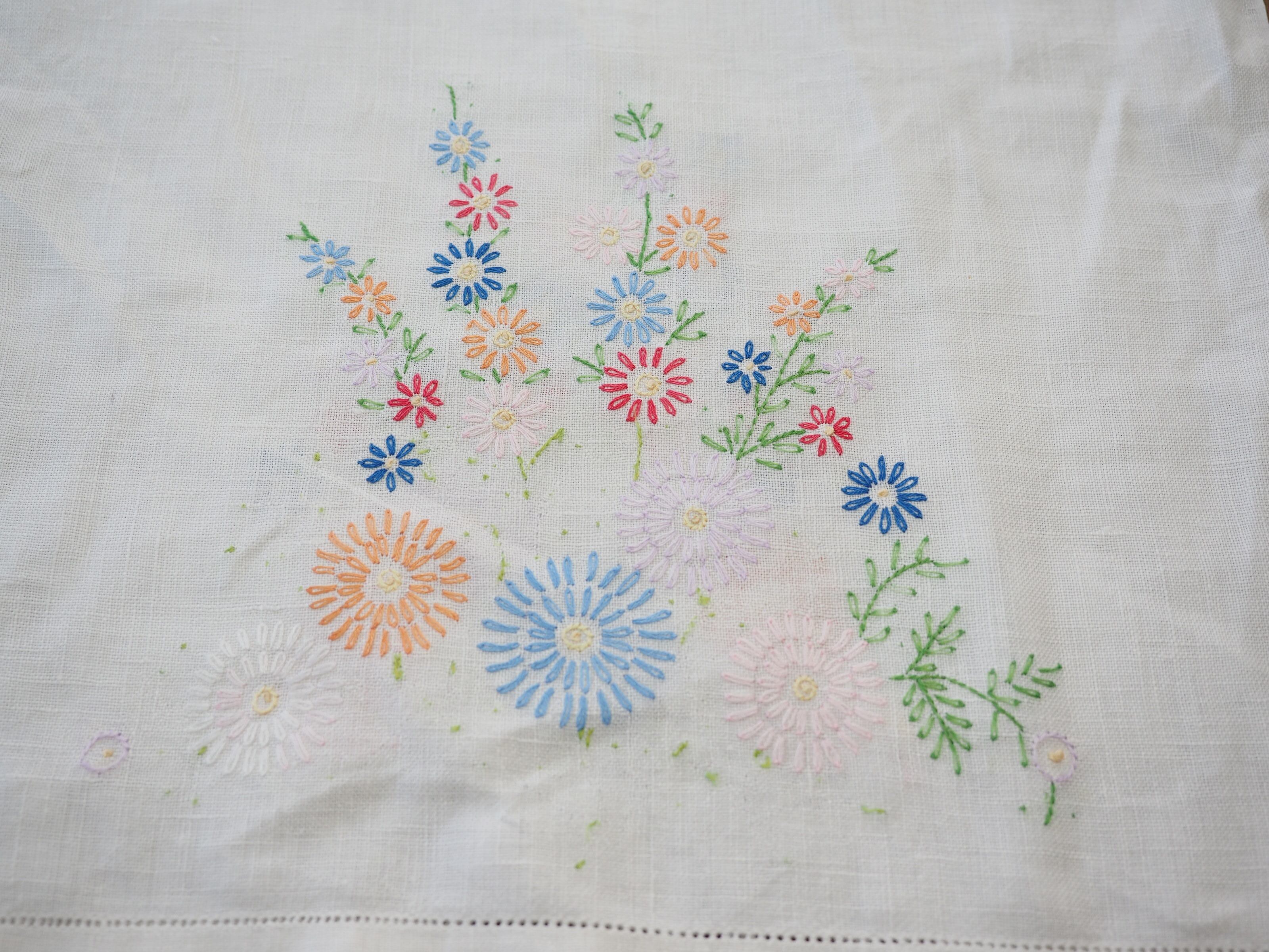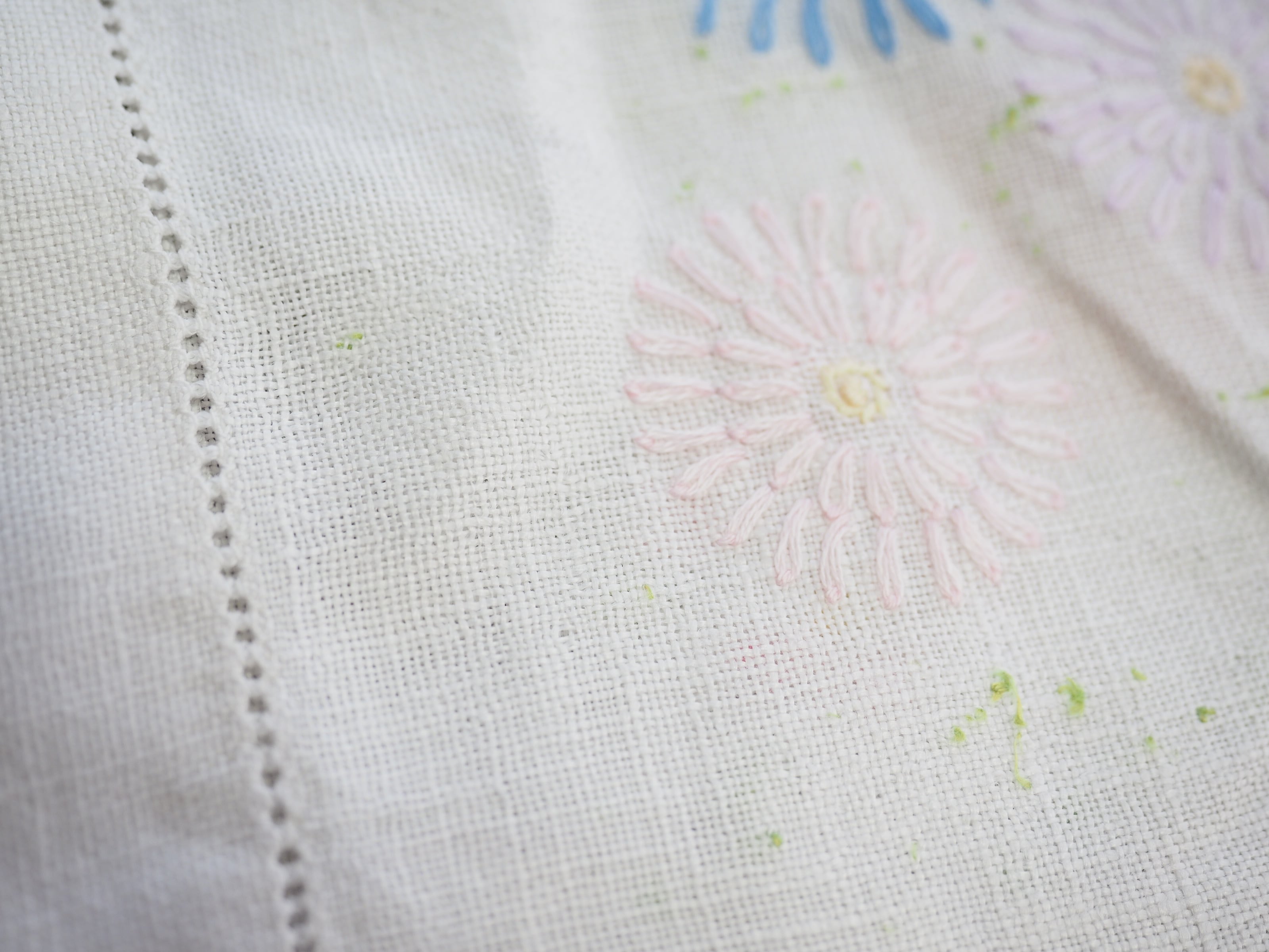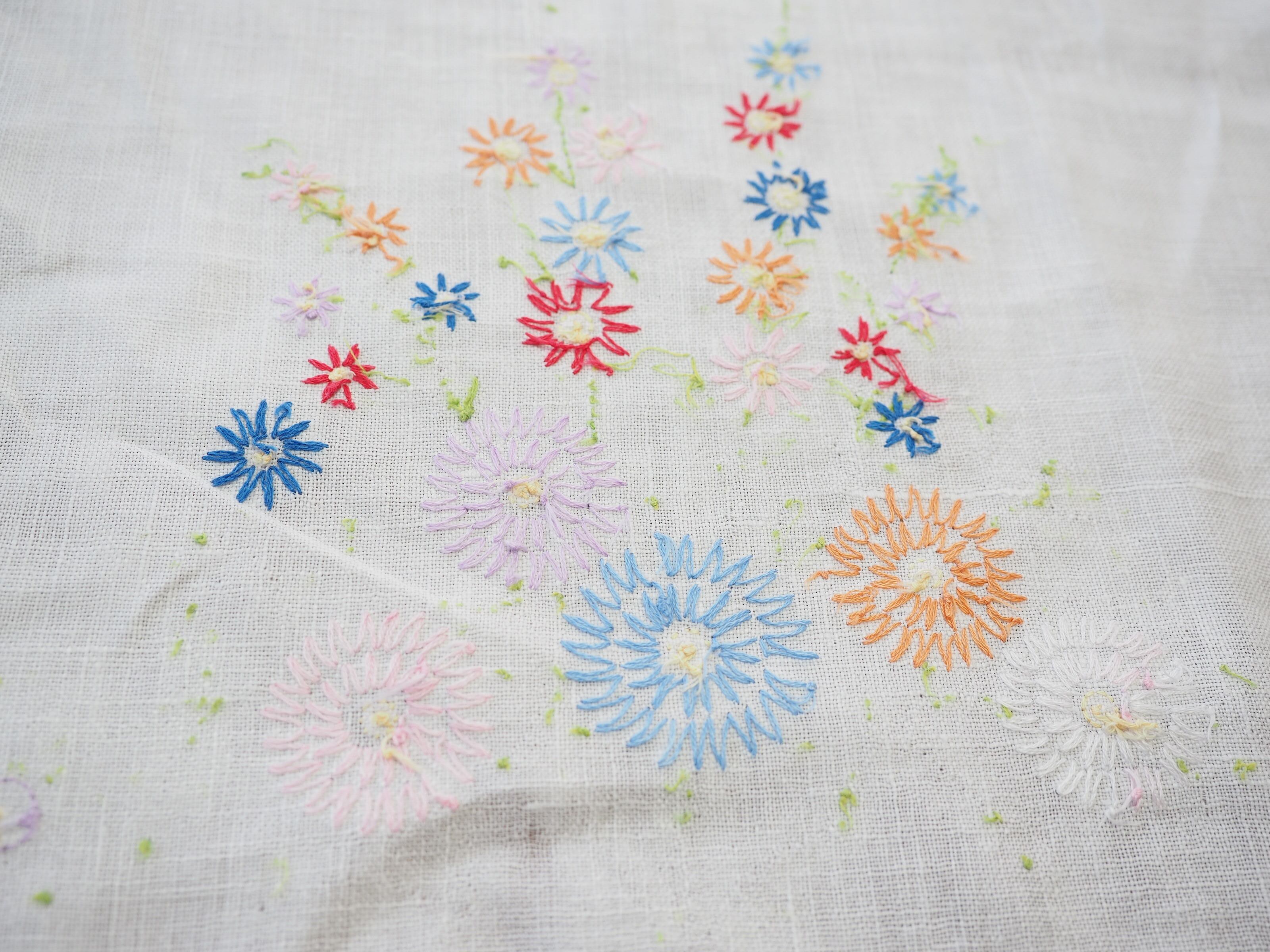 大きな花のまわりにある茎部分の刺繍がほどけてしまったのか、まばらになっていて刺繍穴が残っています。