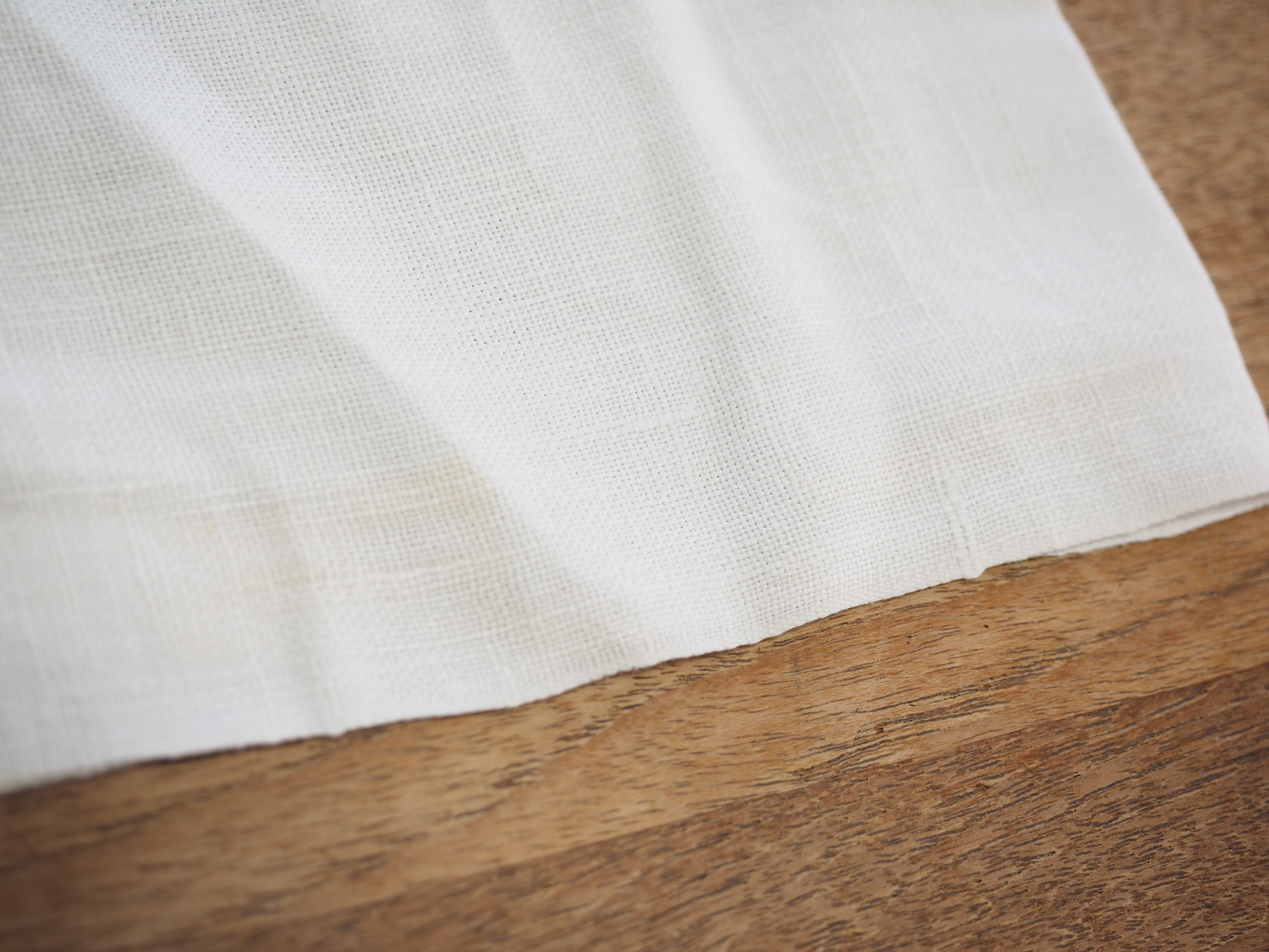 織り模様と小さなネップはありますが、柔らかさが感じられるコットンリネン素材と思われます。