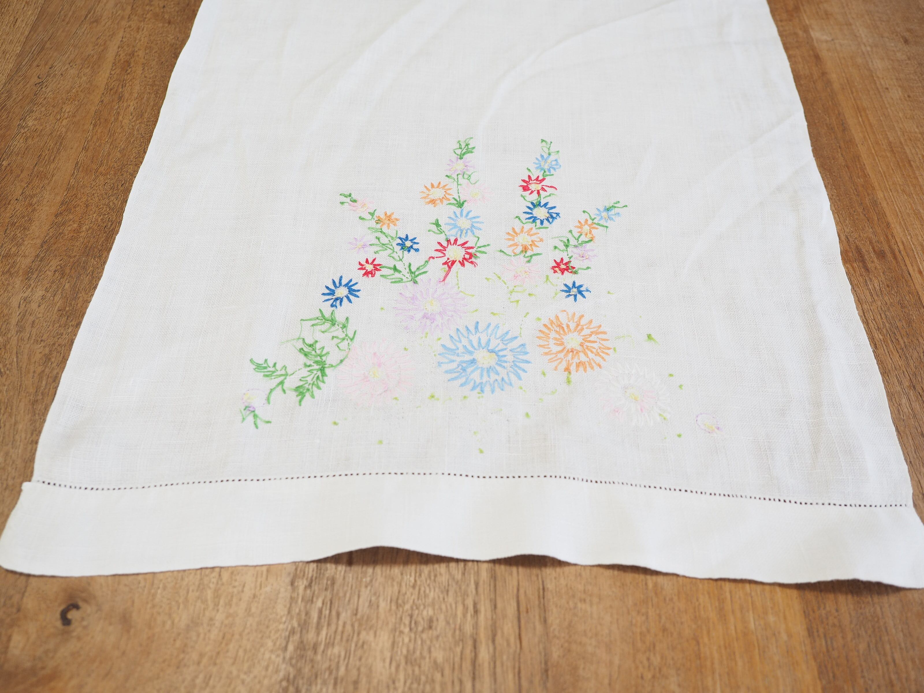 青や紫、オレンジ、ピンク、赤色のデイジーのようなお花刺繍はカラフルですが、押さえた色味で優しい雰囲気です。